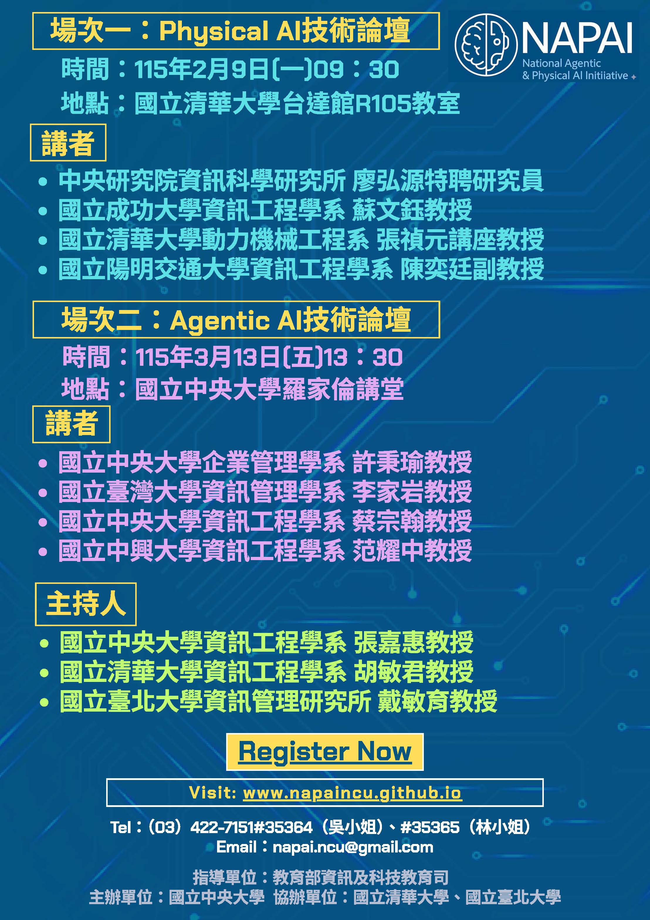 二、旨揭活動主軸聚焦於Agentic AI(智慧代理)與Physical / Robotic AI(實體 AI),邀請學界專家分享最新技術發展趨勢、研究方向及教學與應用經驗,期能協助教師掌握未來 AI人才培育方向,以引導學生投入相關學習。活動資訊如下: (一)Physical / Robotic AI 技術論壇: 1、時間:115年2月9日(星期一)上午9時30分至12時。 2、地點:國立清華大學台達館R105教室 (二)Agentic AI 技術論壇: 1、時間:115年3月13日(星期五)下午1時30分至4時。 2、地點:國立中央大學羅家倫講堂