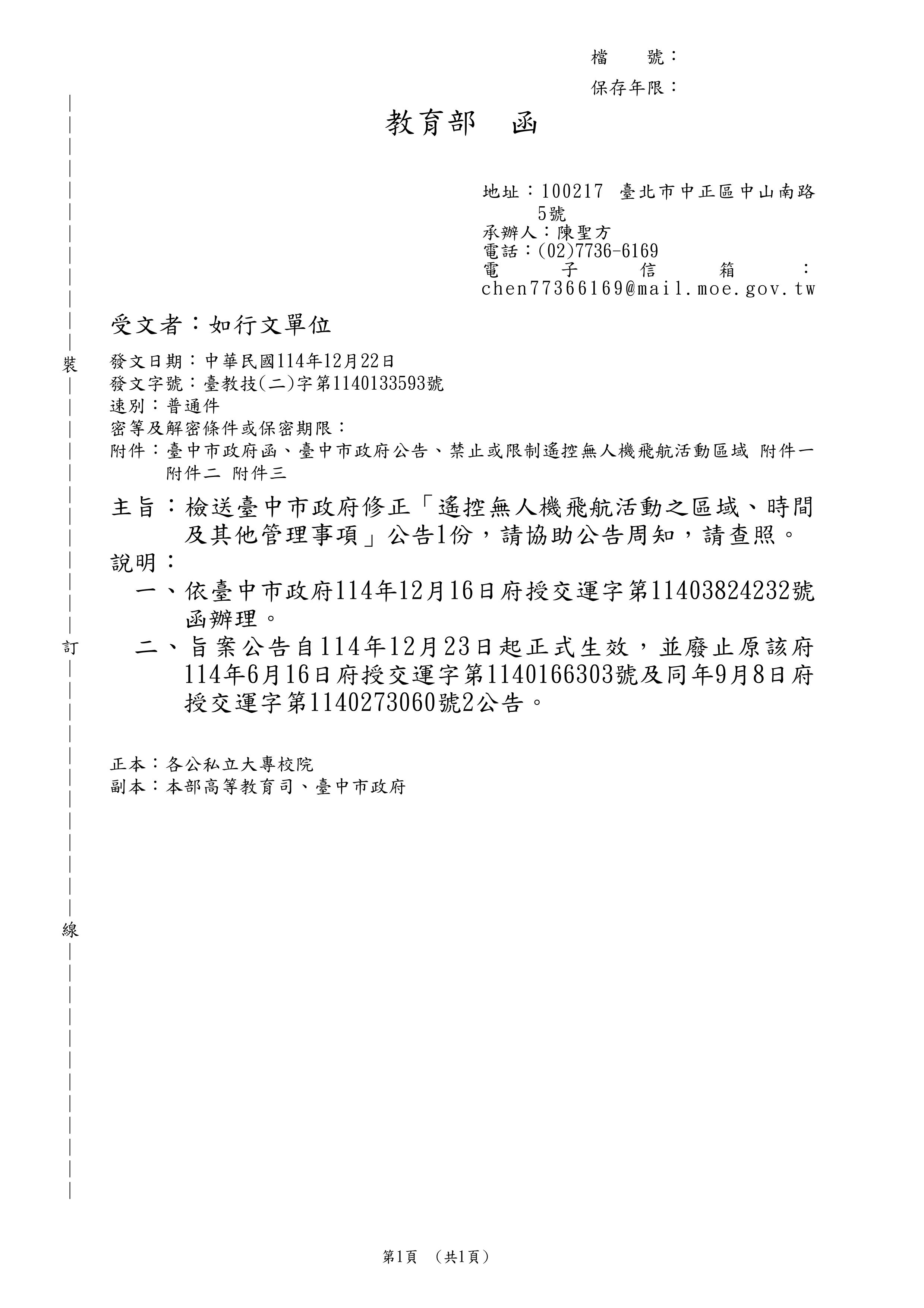 教育部函轉臺中市政府修正「遙控無人機飛航活動之區域、時間