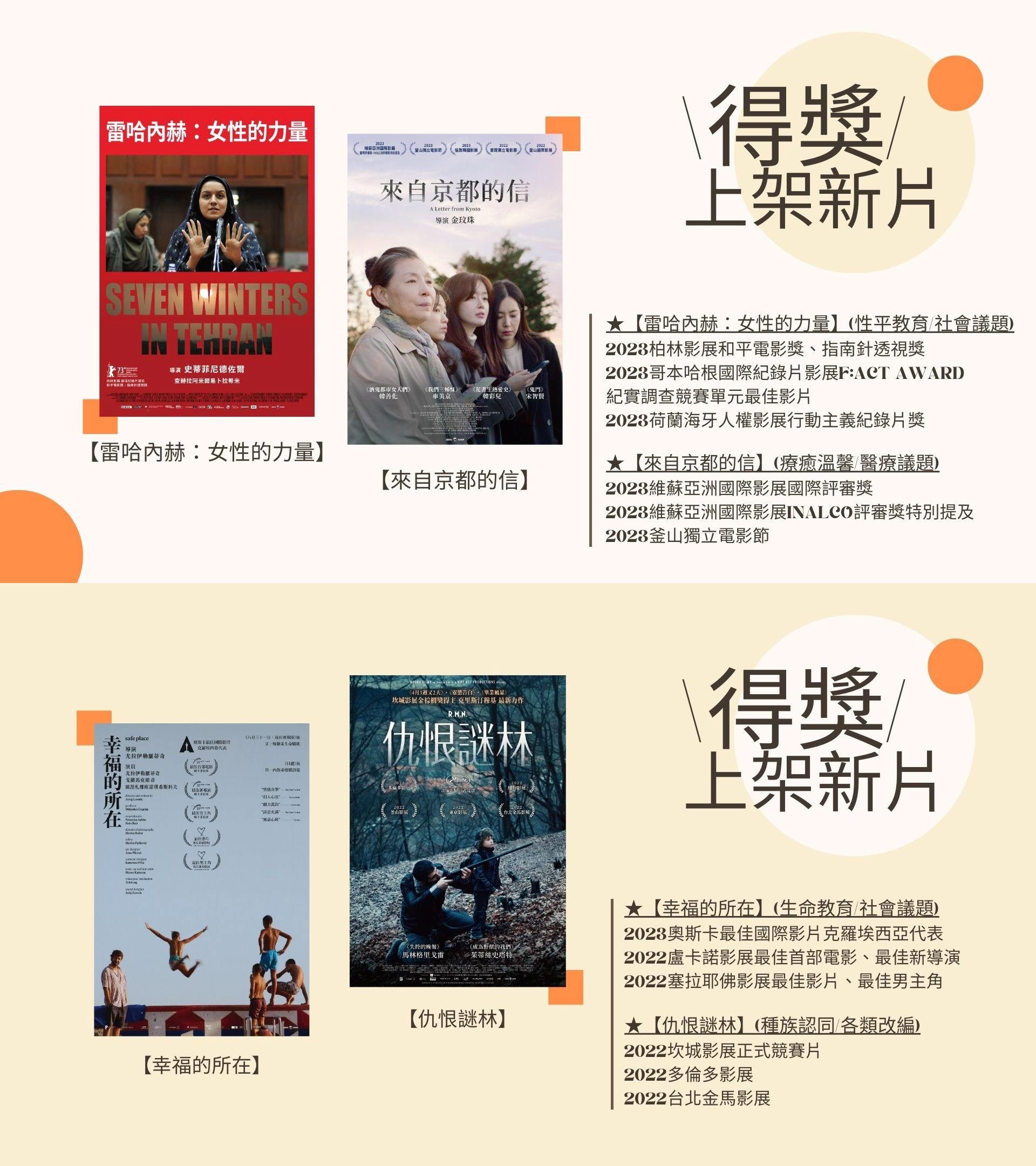 本月新上架影片:15片 1.熊出沒.逆轉時空 2.黑舞士 3.hide:永遠飛翔 4.社畜大變身 5.雷哈內赫:女性的力量 6.魔幻咖啡廳 7.在水中 8.非誠勿擾3 9.神騎魔法大冒險 10.大選風暴 11.我的野男千金 12.放學後失眠的你 13.來自京都的信 14.幸福的所在 15.仇恨謎林