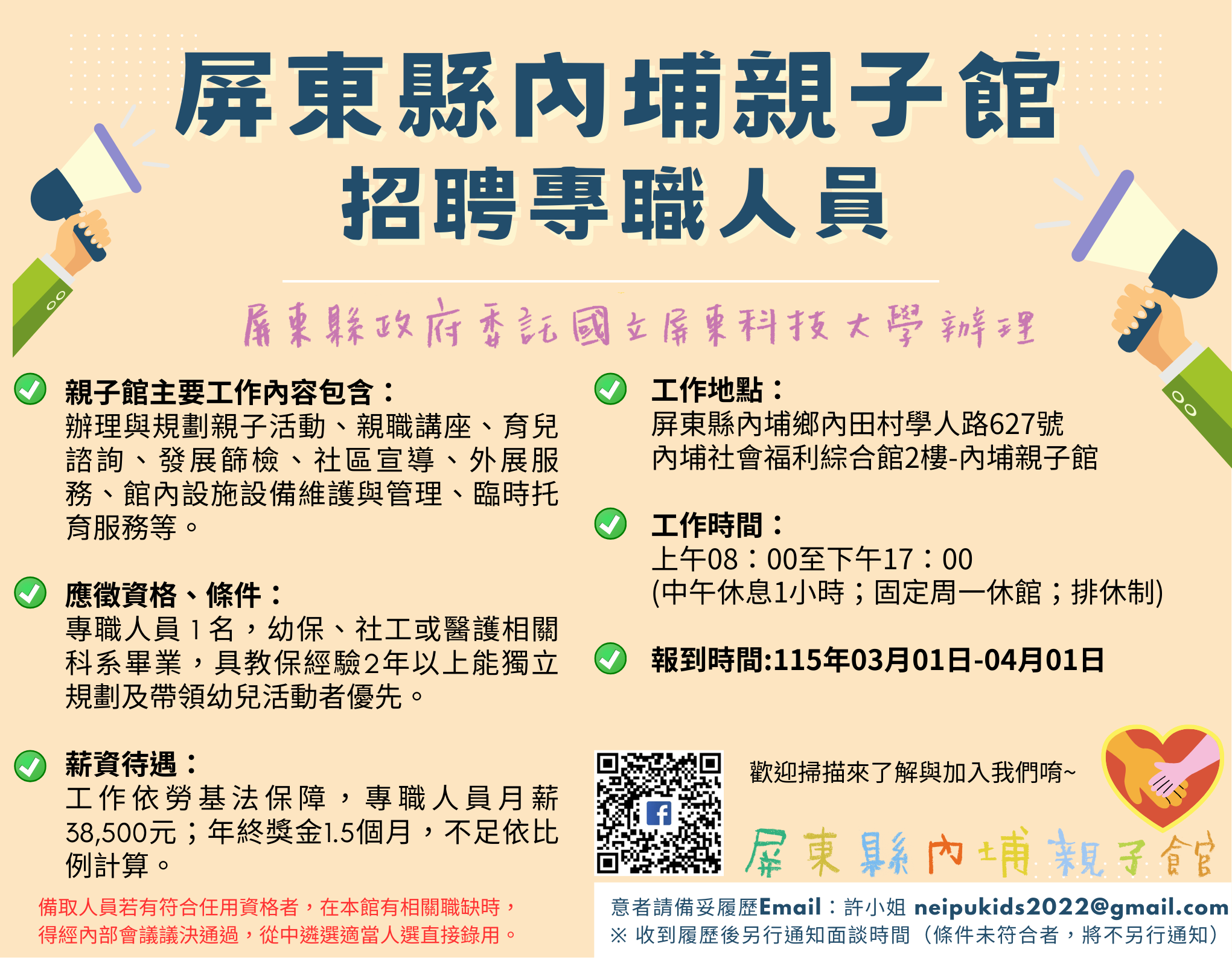 【徵才】屏東縣內埔親子館招聘專職人員