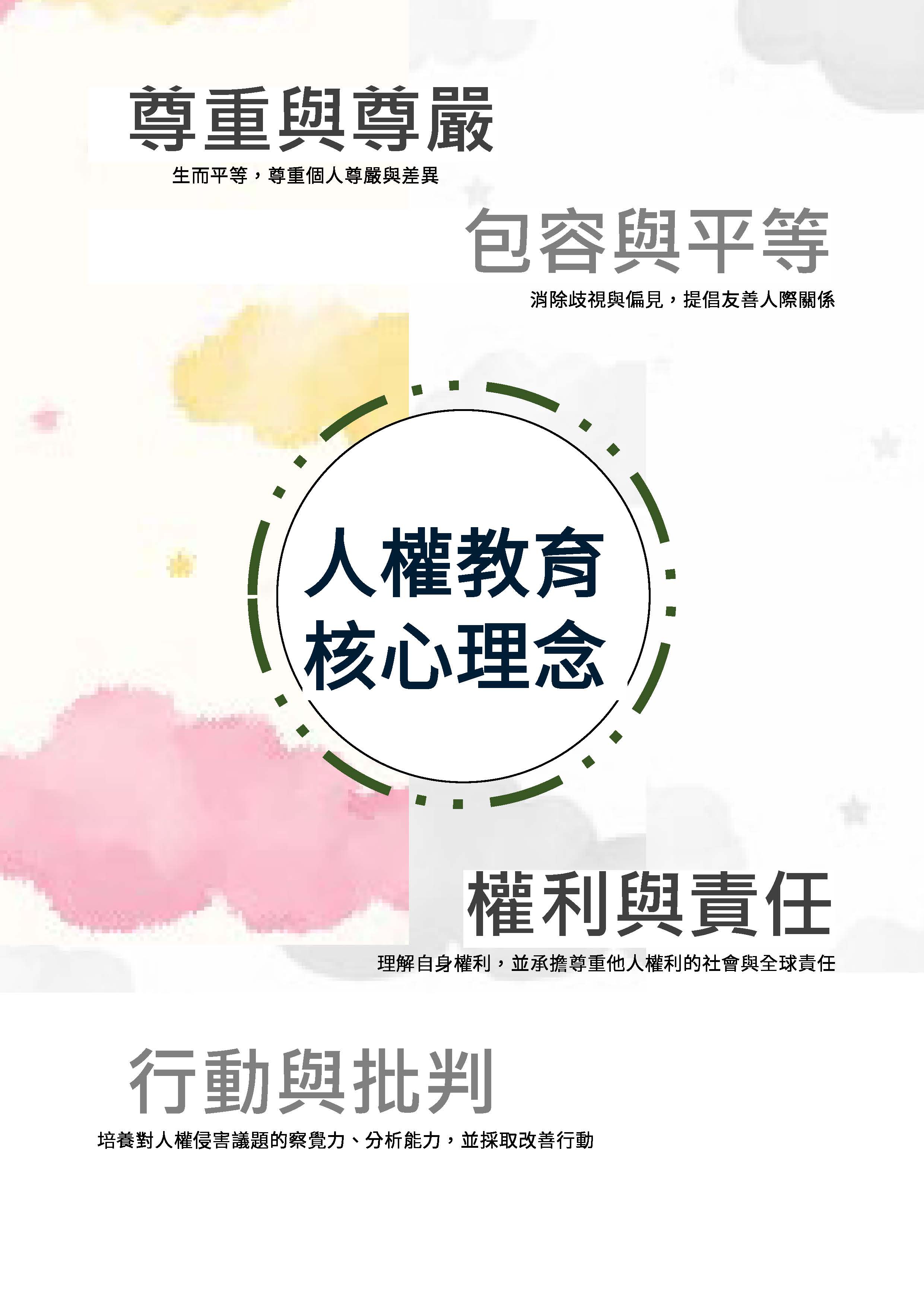 1、尊重與尊嚴:生而平等,尊重個人尊嚴與差異;理解人權是「人之所以為人」的基本條件,保障生理、心理及精神的發展,不因種族、性別、階級而受任意剝奪。