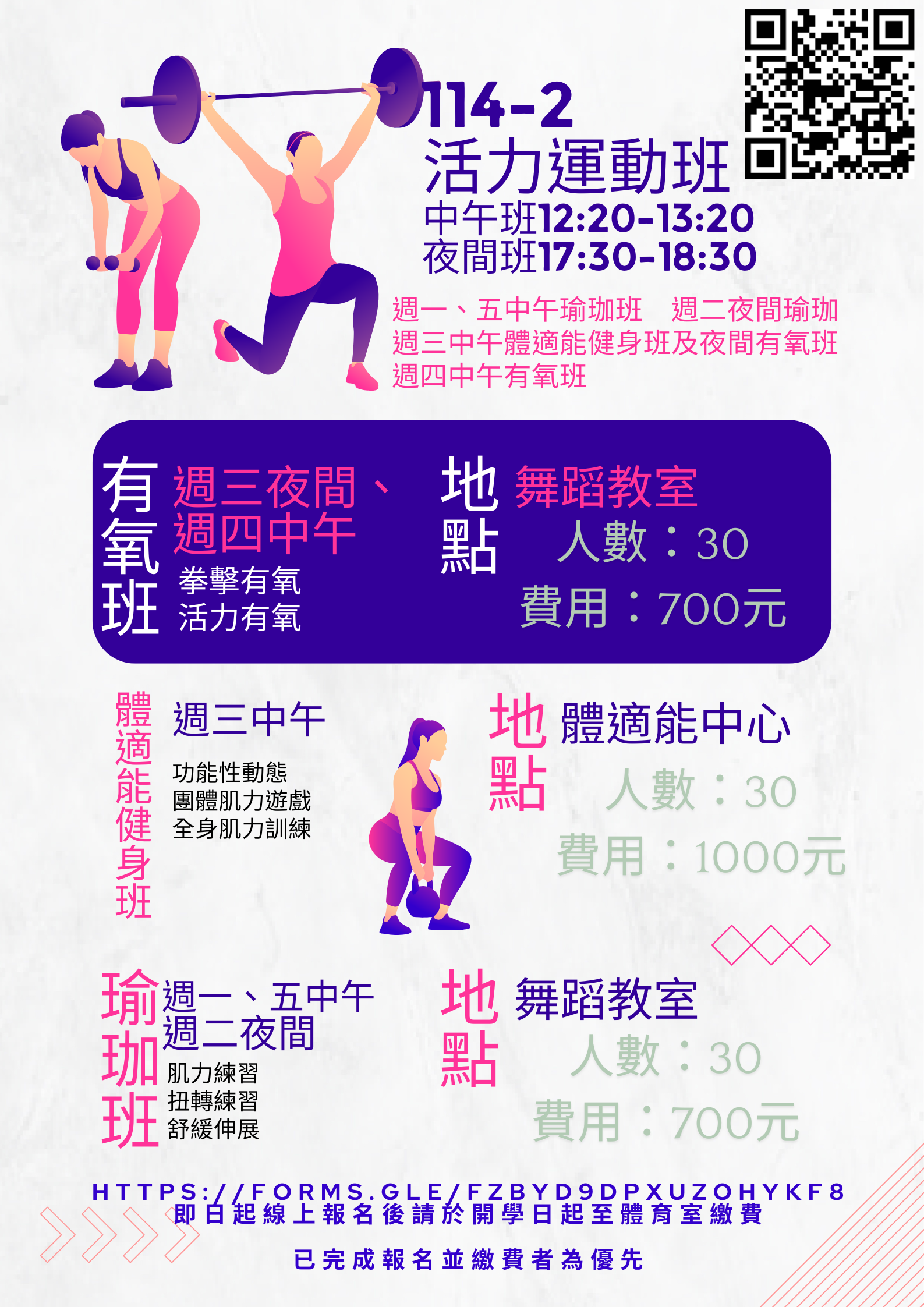主旨:公告114學年度第二學期本室所轄場地開放時間表、體適能中心、游泳池注意事項及活力運動班招生事宜,請 查照。 說明: 一、 開放時間如附件一(P.1),敬請公告。 二、 體適能中心採網路預約制,各開放時段前三日可至本室網站登記,入場時依各身分別收費。(P.2) 三、 辦理游泳證者,自03月23日起可至游泳池,受理辦證,收費標準如附件二(P.2)。 四、 為推廣健康校園本室開設活力運動班,線上報名並於開學日起至體育室現場繳費及職員身份者繳交主管核可表(P.4)。每班招收30名,以報名並繳費者為優先,招生資訊如附件三(P.3)