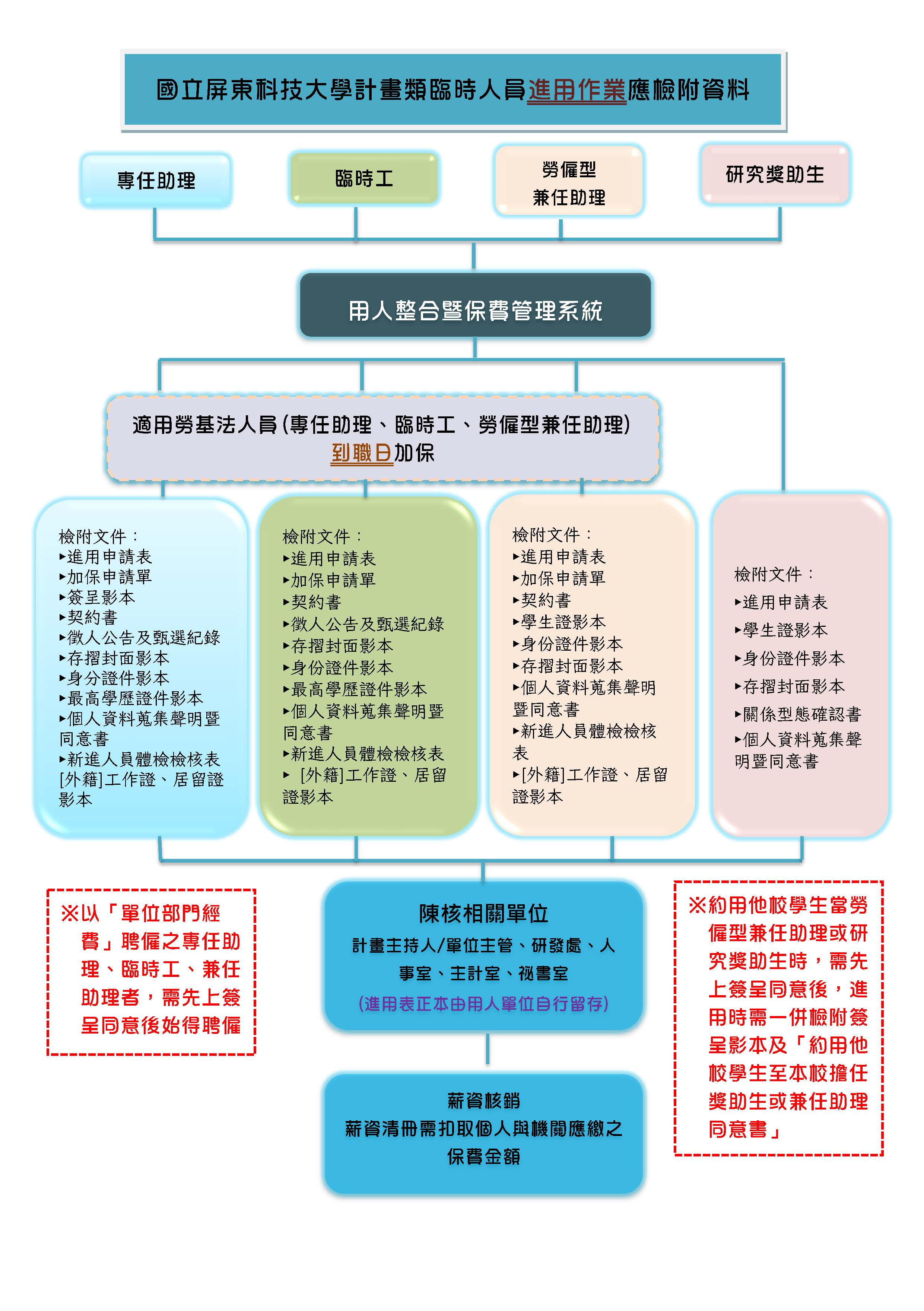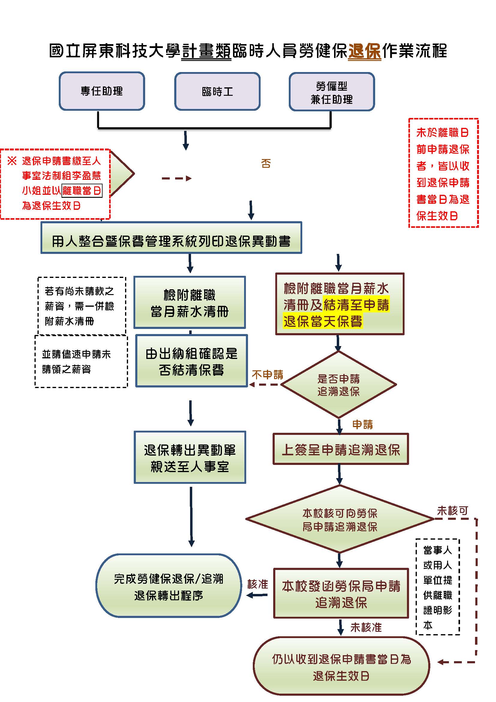 一、專任助理、臨時工、勞雇型兼任助理如有異動(含加退保、調薪、經費來源異動、身分變更等),請務必將勞健保異動申請書送至人事室辦理: 各計畫及用人單位如有僱聘專任助理、臨時工或勞僱型兼任助理,將於115.2.28(星期六)聘期屆滿或離職者、且因115年2月27日起至115年3月1日止適逢228連假及星期假日,故於115.03.01(星期日)前聘僱或調薪生效者、若欲於此段期間聘僱者,請務必於115.2.25(星期三)前將勞健保異動申請書送至人事室辦理,若逾期未辦理勞健保退保轉出或加保者,所衍生之相關費用或責任;將由各計畫主持人或用人單位自行負責,感謝配合! (再次提醒您 ~ 聘僱專任助理、臨時工或勞僱型兼任助理需要加退保、調薪異動時,為保障受僱人權益,請將相關異動申請單"親送"至人事室,請"勿"放置收發室信箱或與其他資料裝訂一起;以免影響保險時效。)