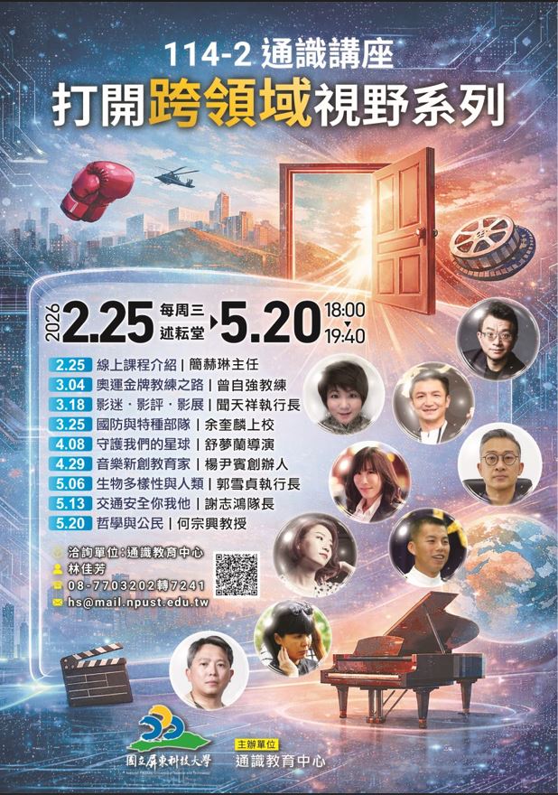 開學第1次通識教育講座--以線上課程方式辦理 🗓️ 時間: 自即日起至2026/3/3(線上課程) 💻 方式: 請至數位學習平台觀看影片,並在表單中完成簽到與課程資料填寫,方可列入出席分數。 自下週(3/4)起轉為實體上課,請學生提早依座位入座,座位表另行通知! 🗓️ 時間: 2026/3/4 第9.10節(下午6:00至7:40) 📍 地點: 本校述耘堂 ⚠️ 注意: 請依排定座位入座(座位表另行通知)。 🔔提醒: 上課完成簽到才能確保出席分數。