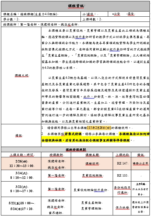 本課程*第一次*上課暨課程說明時間為:115年02月26日(四)下午12點30分,地點:RE 147