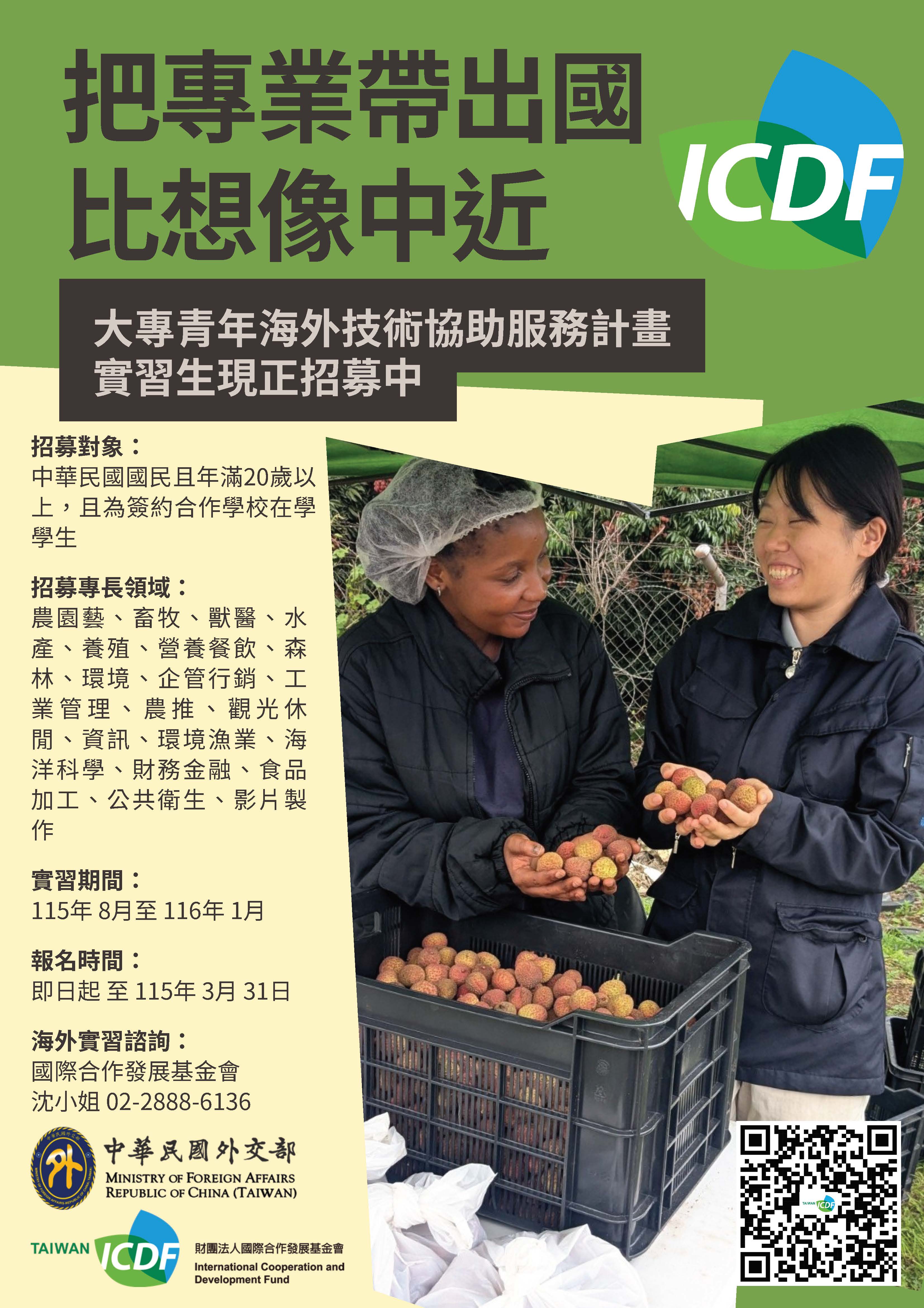 ※本計畫執行依據為「財團法人國際合作發展基金會大專青年海外技術協助服務管理要點」,實習計畫期程以一學期(六個月)為原則,預計為115年度8月啟程出國,欲申請本計畫之同學請務必詳細閱讀本管理要點。 ★115年度第8屆「大專青年海外技術協助服務計畫」海外實習生共計有31個名額開放各校學生申請,包含農園藝9名、水產養殖4名、畜牧獸醫3名、森林環境3名、企管行銷2名、營養餐飲2名、工業管理1名、環境漁業/海洋科學1名、財務金融/合作經濟暨社會事業經營1名、食品加工2名、公共衛生1名、影片製作1名、土木結構工程1名,詳細實習內容及實習需求條件請參閱海外實習需求規畫表。 一、申請說明如下: 1.申請時間:即日起至115年3月24日截止,逾期不受予辦理! 2.申請資格: (1)具中華民國國籍,並於本校就讀一學期以上之在學學生。 (2)年齡須為20歲(含)以上者。 (3)申請科系依實習需求規劃表之建議科系為主。 (4)外語能力須達新版多益350分,或全民英檢中級初試,或其他具有相同標準之語 言測驗機構舉辦之外語能力測驗。 (5)專業能力依實習需求規劃表之建議修畢課程及經歷為主。 (6)身心健康狀況、體力及人格特質均足以獨立適應海外生活者。 3.申請作業程序:將申請表及相關文件,經系主任核章後送交教務處課務組辦理。 4.時程規劃:大專青年海外技術協助服務計畫申請作業由各合作學校窗口負責辦理, 每年開放申請時間預計為3月至4月,錄取後於當年8月赴海外實習至隔年1月實習期 滿返臺(實習期間仍具合作學校學籍) 二、申請文件如下: 1.履歷表(*請留意:學生若申請多個計畫,僅須填寫一份履歷表及切結書,並再履歷 表上註明申請多個計畫各自之實習動機等內容即可) 2.實習切結書 3.歷年成績單(含成績排名) 4.缺曠課紀錄 5.獎懲紀錄 6.健康告知聲明書 7.指導教授推薦函 8.外語能力證明文件 9.其他相關經歷加分證明文件 10.申請志願序 三、聯絡窗口: 屏科大教務處課務組 劉小姐 |分機:6406 | Mail:npustsb@gmail.com 財團法人國際合作發展基金會 沈小姐 |連絡電話:02-2888-6136 四、線上宣傳會 ◆時間:115年3月16日