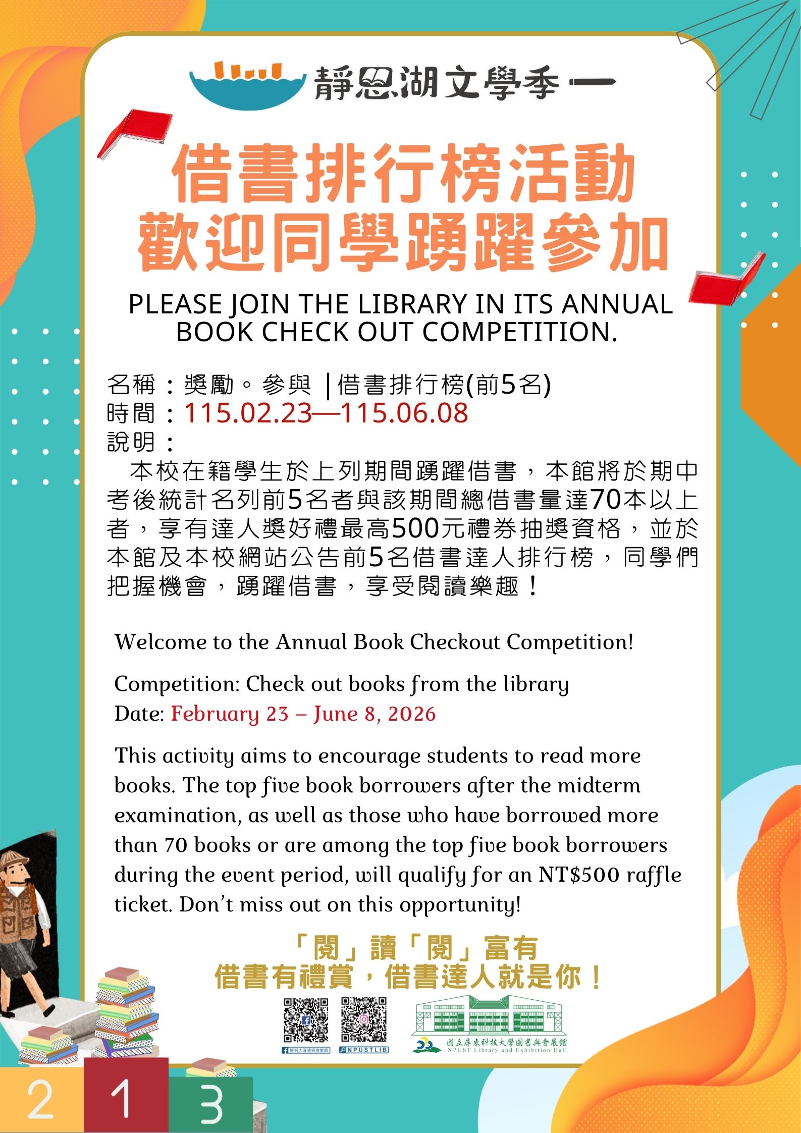 How to Join: Check out books from the library. Time of the Activity: February 23rd – June 8th, 2026. Description of the Activity: This Activity was created to encourage students to read morebooks. The students who are the top five book-borrowing afterthe midterm examination and those who had borrowed morethan 70 books or the top five book-borrowing during the eventperiod will be eligible for the NT$500 raffle ticket. Don’t missout on this opportunity!