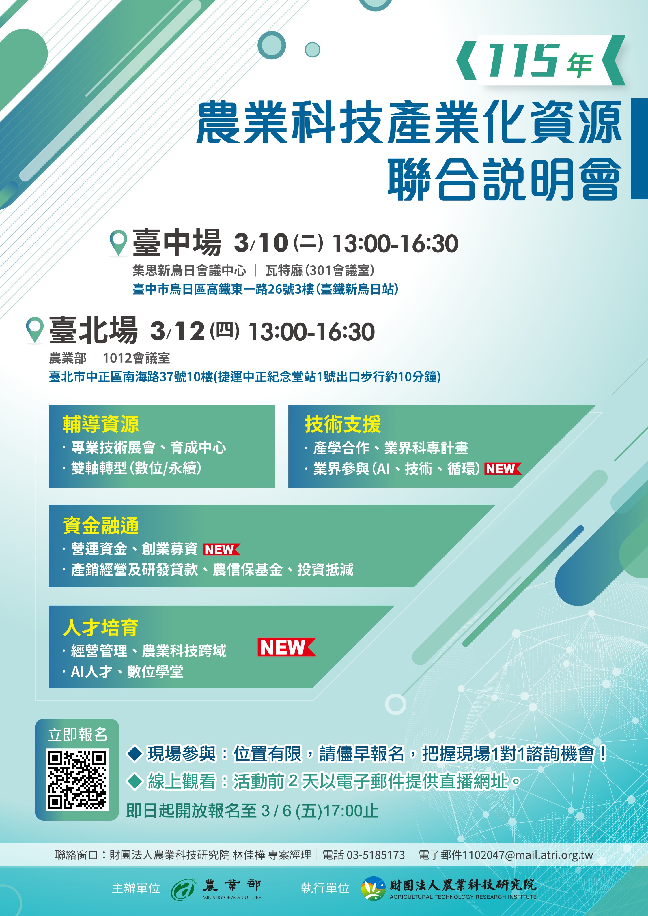 二、為持續協助產業界了解農業科技產業化資源內容,本部訂於本(115)年3月10日(二)及3月12日(四)辦理旨揭活動,邀請相關單位到場說明,並提供現場一對一諮詢服務,另同步提供線上直播,請協助轉知相關單位把握機會,踴躍報名參加。