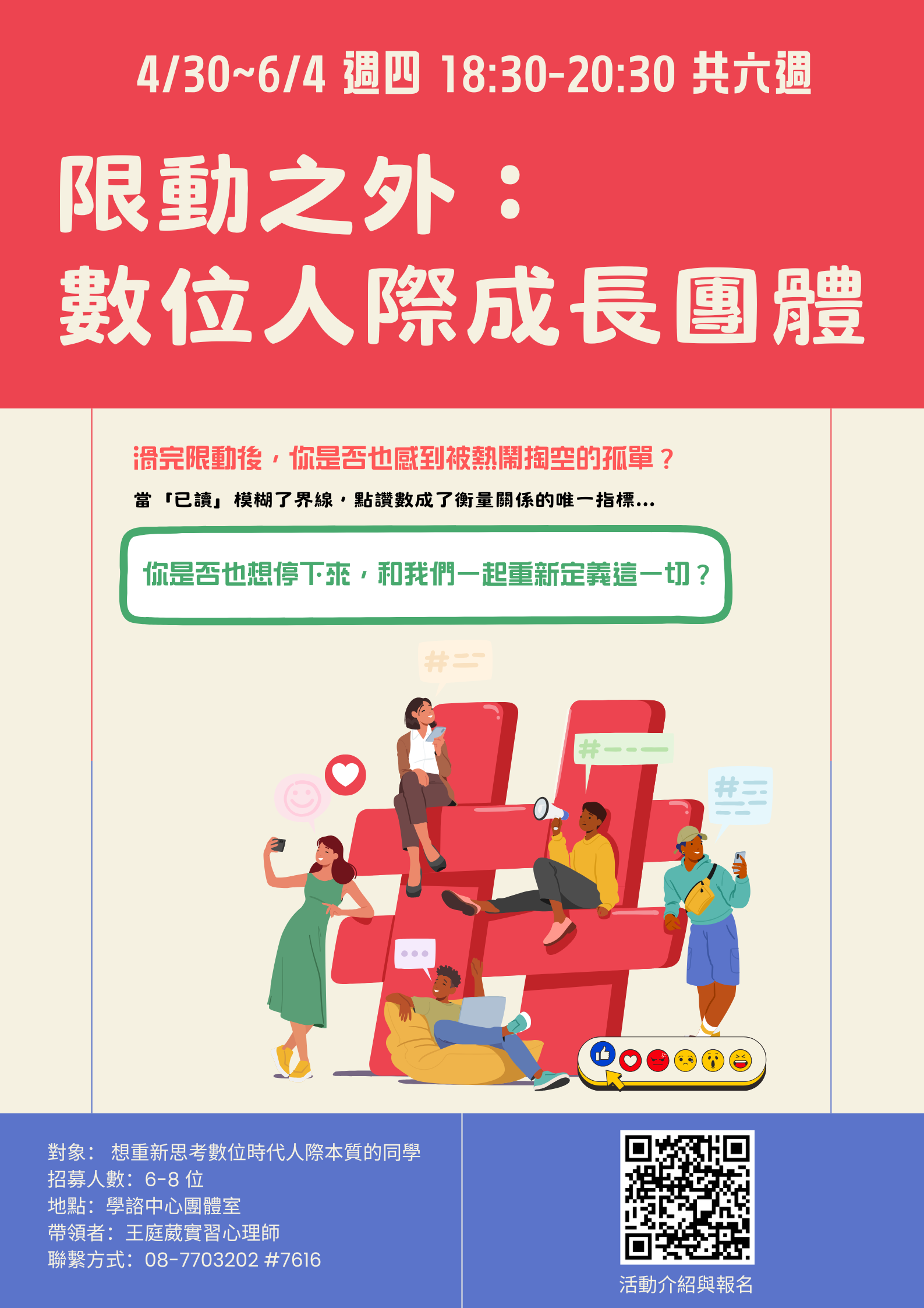 🌠團體資訊: 一、時間:115/4/30~115/6/4,週四晚上18:30-20:30,共計六週(日期:4/30、5/7、5/14、5/21、5/28、6/4) 二、地點:學生諮商中心團體諮商室 三、對象:願意思索數位時代的人際本質,想重新釐清自我與他人界線的本校學生 四、招募人數:6-8 位 五、報名截止日期:即日起至 4/10(五) 為止 六、帶領者:王庭葳實習心理師