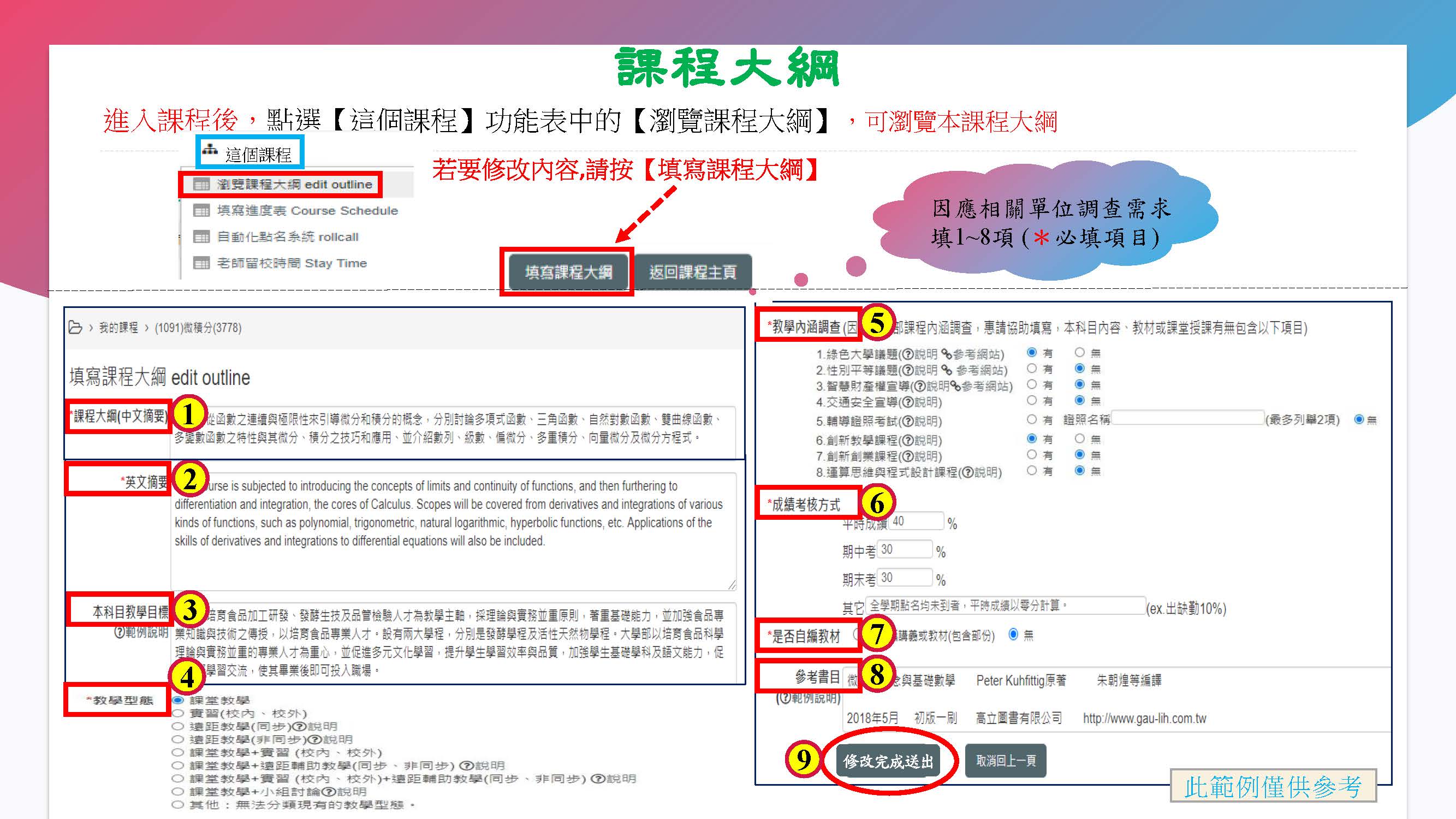 三、因應相關單位調查需求,平台除需填寫中英文課程大綱、課程進度、教材、成績考核及課餘留校時間外,另增列填寫項目,包括:教學目標、教學型態、教學內涵、是否自編教材(含部分)、參考書目及課程SDGs關聯性等。