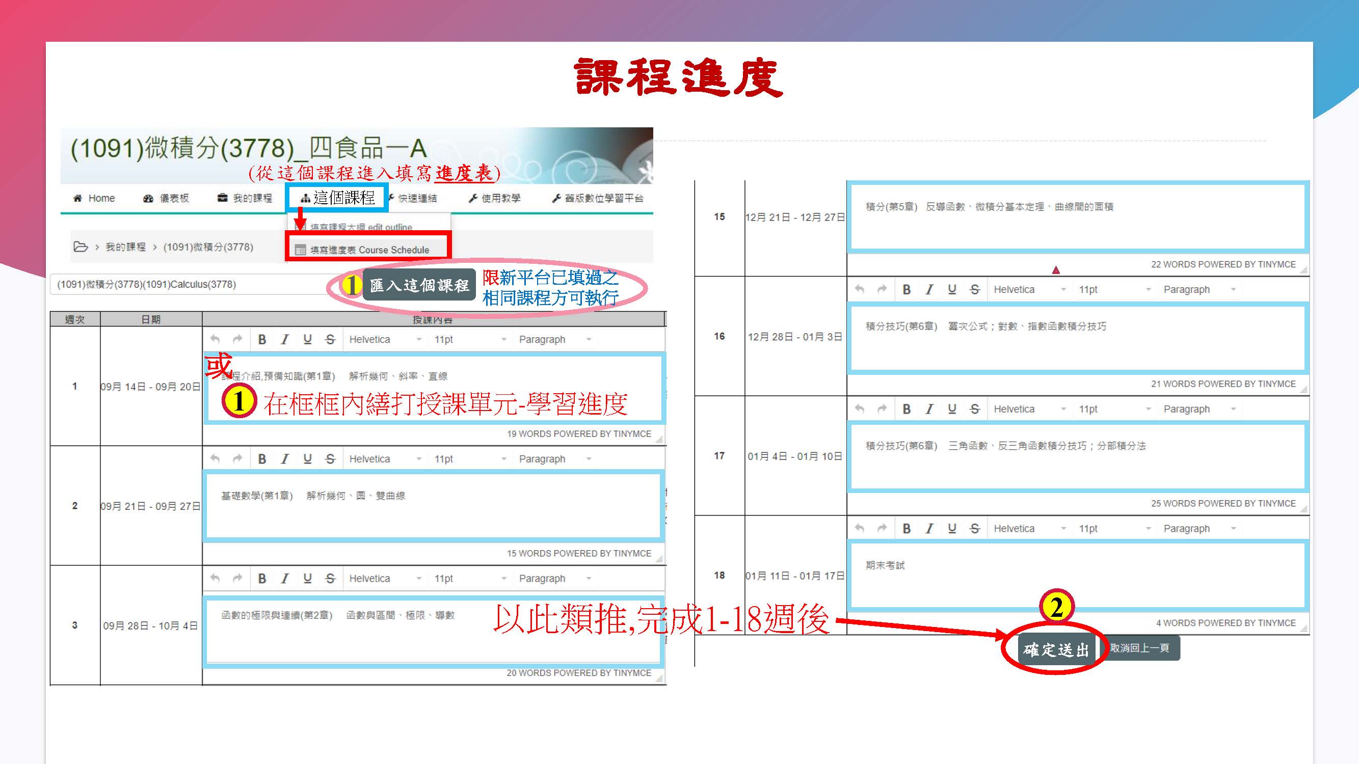 四、碩(博士)論文、實務專題、專題討論、專題實務、外語實務等課程,由課務組統一處理;惟仍請授課教師上網確認「中英文課程大綱」及「課程進度」內容是否符合授課需求,如有不符請自行修正。 (一)課程進度填寫說明:如當週無需上課(如微型課程或特色課程等),請於該週填寫「無」、「不須上課」或「放假」,以利系統辨識填寫完成(第1至18週皆須填寫,如任一週未填即視為未完成)。 (二)多人合授課程(如校外實習、產業實習或系所專業課程等),請推派一位教師負責填寫。