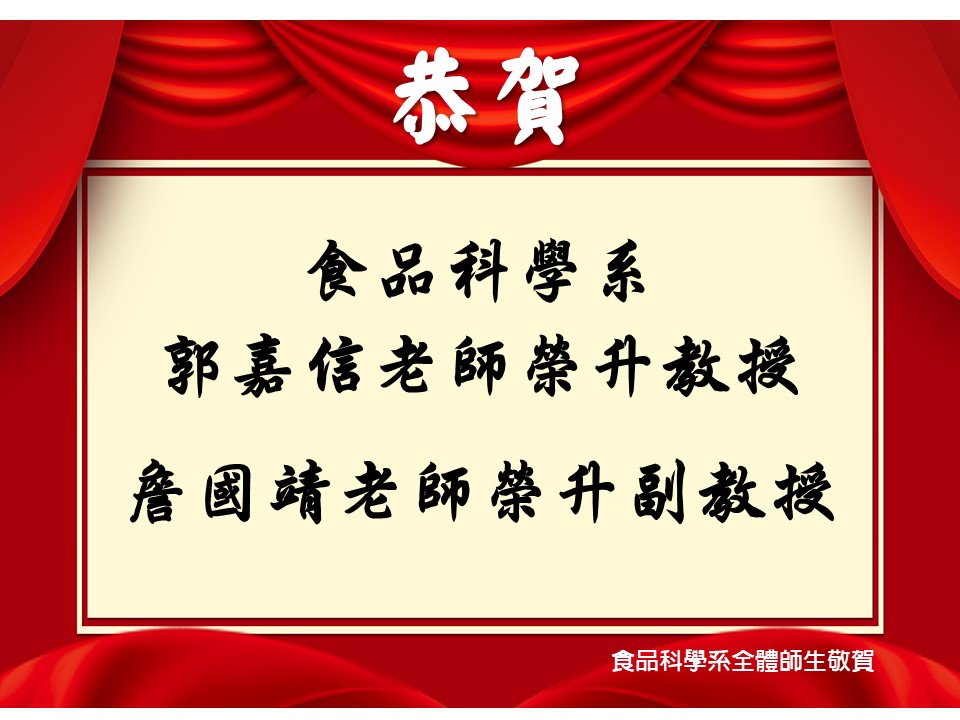 恭賀~~食品科學系郭嘉信老師榮升教授、詹國靖老師榮升副教授