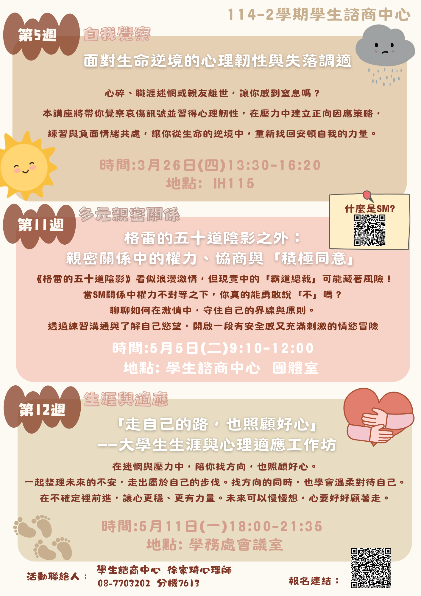 •時間:115/05/11(一) 18:00-21:35 •地點:學務處會議室 •對象:本校學生 •人數:限額25名 •報名連結:https://forms.gle/qyGtR6gabGVQeEFTA •報名截止:4/27(一)會透過E-mail告知錄取 •活動聯絡人:學生諮商中心徐家琦心理師08-7703202分機7613