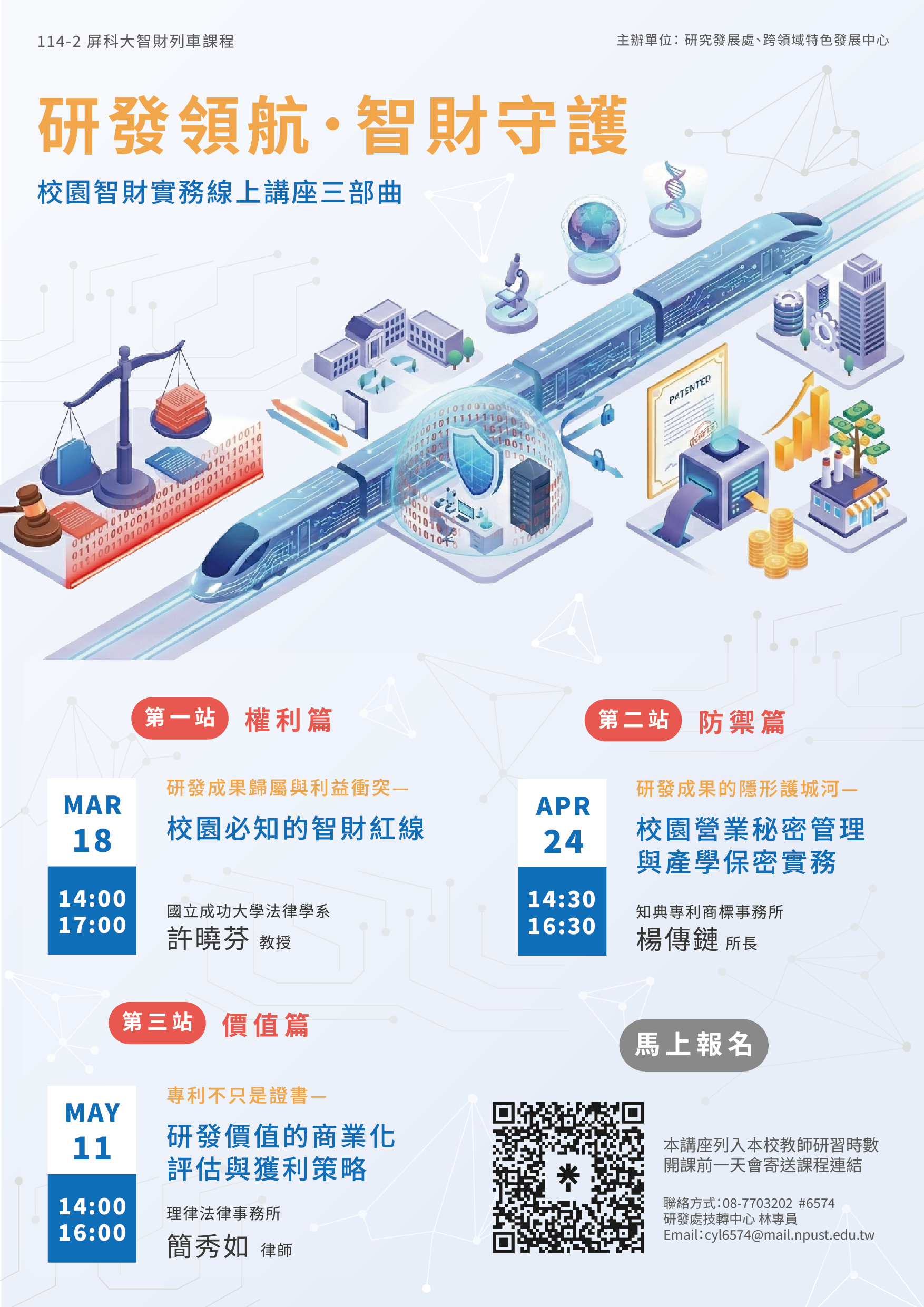 「研發成果歸屬與利益衝突—校園必知的智財紅線」即將開課囉! 時間:115年03月18日(五) 14:00-17:00 講師:國立成功大學 法律學系 許曉芬教授 線上研習連結 https://reurl.cc/mpLYzA *請有參加的職員一周內將主管核可表繳交至研發處