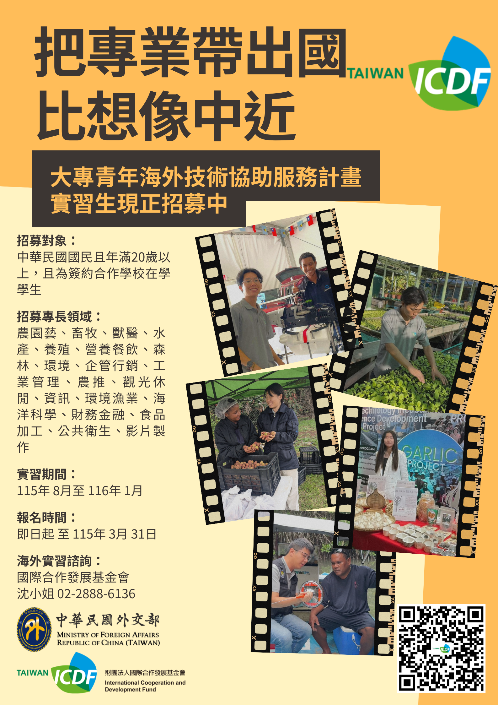 📌相關連結:https://www.icdf.org.tw/wSite/np?ctNode=31786&mp=1 📌本計畫執行依據為「財團法人國際合作發展基金會大專青年海外技術協助服務管理要點」,實習計畫期程以一學期(六個月)為原則,預計為115年度8月啟程出國,欲申請本計畫之同學請務必詳細閱讀本管理要點。 📌115年度第8屆「大專青年海外技術協助服務計畫」海外實習生共計有31個名額開放各校學生申請,包含農園藝9名、水產養殖4名、畜牧獸醫3名、森林環境3名、企管行銷2名、營養餐飲2名、工業管理1名、環境漁業/海洋科學1名、財務金融/合作經濟暨社會事業經營1名、食品加工2名、公共衛生1名、影片製作1名、土木結構工程1名,詳細實習內容及實習需求條件請參閱海外實習需求規畫表。 一、申請說明如下: 1.申請時間:即日起至115年3月24日截止‼️‼️‼️ 2.申請資格: (1)具中華民國國籍,並於本校就讀一學期以上之在學學生。 (2)年齡須為20歲(含)以上者。 (3)申請科系依實習需求規劃表之建議科系為主。 (4)外語能力須達新版多益350分,或全民英檢中級初試,或其他具有相同標準之語言測驗機構舉辦之外語能力測驗。 (5)專業能力依實習需求規劃表之建議修畢課程及經歷為主。 (6)身心健康狀況、體力及人格特質均足以獨立適應海外生活者。 3.申請作業程序:將申請表及相關文件,經系主任核章後送交教務處課務組辦 理。 4.時程規劃:大專青年海外技術協助服務計畫申請作業由各合作學校窗口負責辦理,每年開放申請時間預計為3月至4月,錄取後於當年8月赴海外實習至隔年1月實習期滿返臺(實習期間仍具合作學校學籍) 二、📝申請文件如下: 1.履歷表(*請留意:學生若申請多個計畫,僅須填寫一份履歷表及切結書,並再履歷表上註明申請多個計畫各自之實習動機等內容即可) 2.實習切結書 3.歷年成績單(含成績排名) 4.缺曠課紀錄 5.獎懲紀錄 6.健康告知聲明書 7.指導教授推薦函 8.外語能力證明文件 9.其他相關經歷加分證明文件 10.申請志願序 三、線上宣傳會📣📣📣 ◆時間:115 年3月20日(五)上午10:00-11:00 ◆線上宣傳說明會連結:https://meet.google.com/kro-xswx-jfz(不用密碼就可以進入會議室)