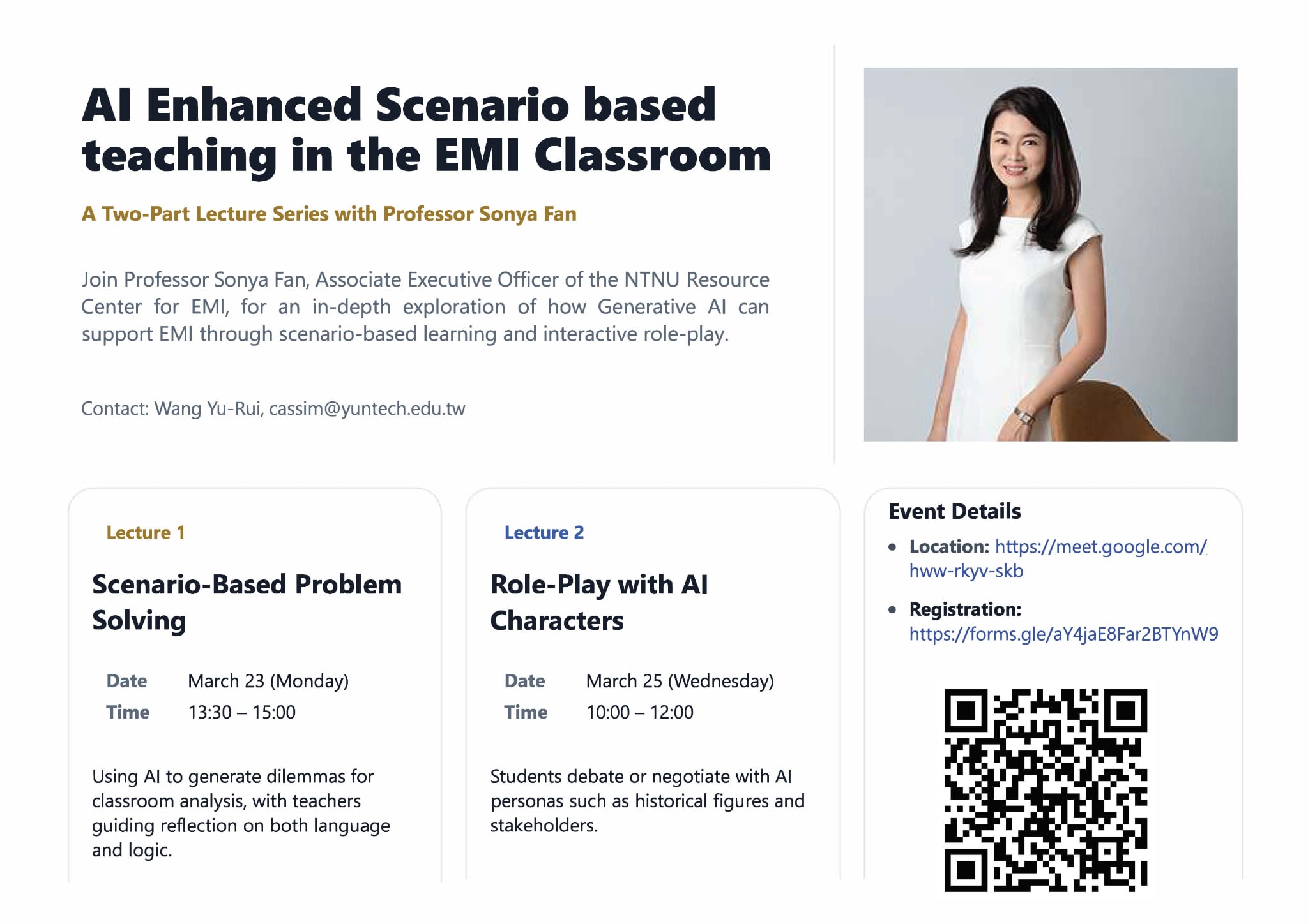 三、講座資訊如下: (一)第一場:115年3月23日(星期一)下午1時30分至3時,主題為「Using AI to generate dilemmas for classroom analysis, with teachers guiding reflection on both language and logic」。