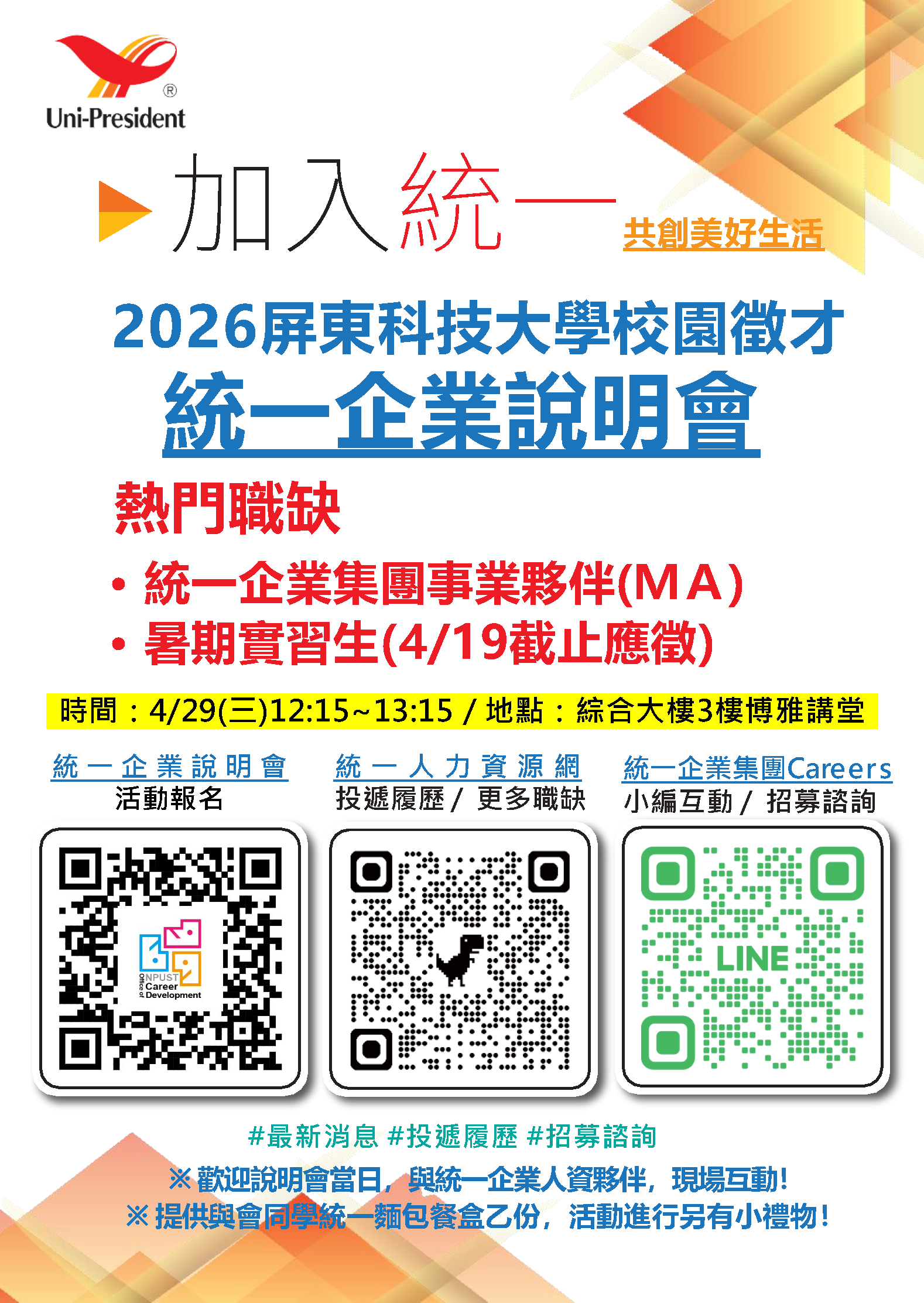【廠商說明會】2026 統一企業 廠商說明會,歡迎有興趣同學踴躍參加~