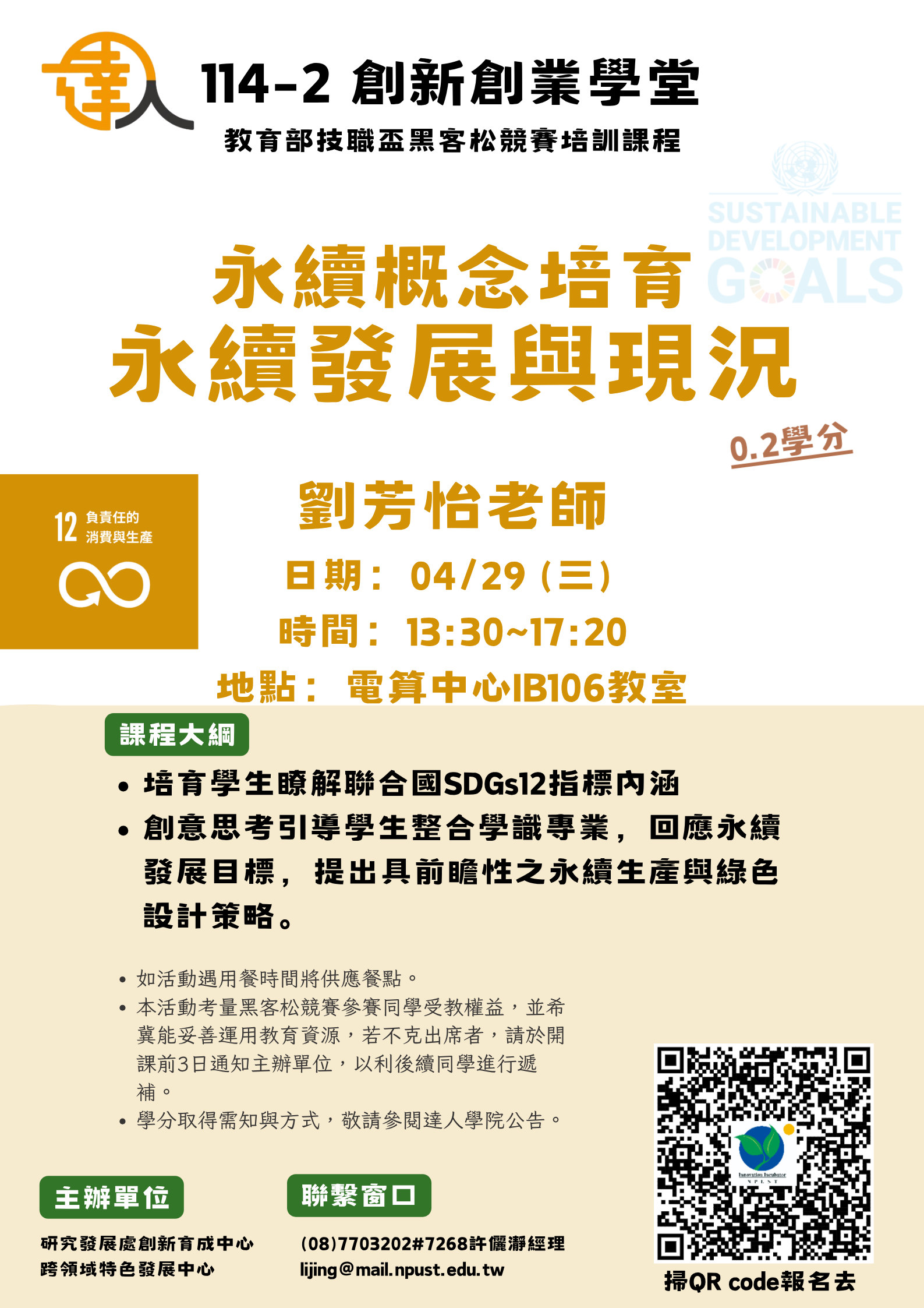 (三)永續概念培育永續發展與現況/學分:0.2 1.課程日期:2026/4/29(三) 2.課程地點:電算中心IB106教室 3.課程時間:13:30~17:20 4.講師: 劉芳怡老師 5.報名連結: https://forms.gle/MVQAR2sw9jQNfUgNA