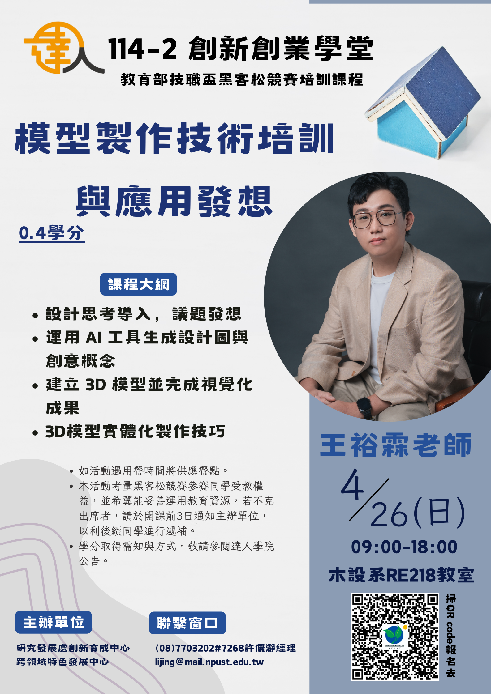 (五)模型製作技術培訓與應用發想/學分:0.4 1.課程日期:2026/4/26(日) 2.課程地點:木設系RE218教室 3.課程時間:09:00~18:00 4.講師: 王裕霖老師 5.報名連結: https://forms.gle/Djk9K9xisZKaiaVb7