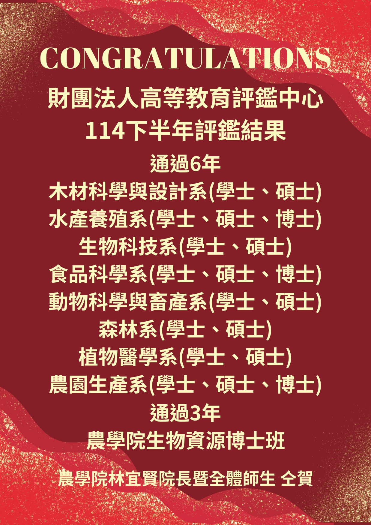 恭喜!農學院所屬系所通過財團法人高等教育評鑑中心114下半年評鑑認可結果優異
