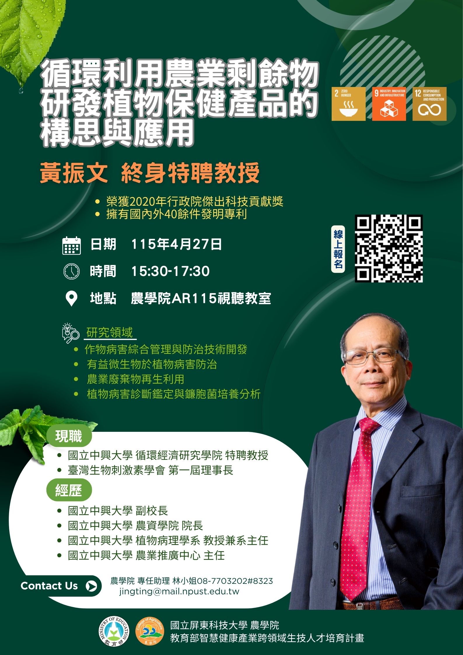 專題演講:農學院邀請國立中興大學黃振文終身特聘教授蒞臨演講「循環利用農業剩餘物研發植物保健產品的構思與應用」,歡迎師生踴躍到場聆聽