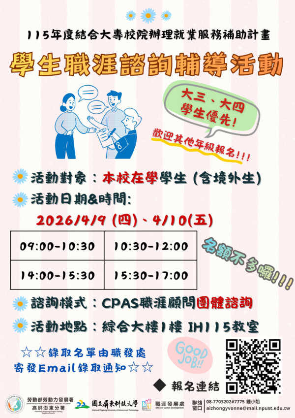 ★活動場次時間(CPAS職業適性診斷測驗場次): 04/09(四) 時段B 10:30-12:00 (僅剩2名額!) 04/09(四)時段C 14:00-15:30(僅剩1名額!😲) 04/09(四) 時段D 15:30-17:00 (僅剩1名額!😲) 04/10(五) 時段A 09:00-10:30 (僅剩1名額!😲) 04/10(五) 時段B 10:30-12:00 (僅剩2名額!) 04/10(五) 時段D 15:30-17:00 (僅剩1名額!😲) ★活動對象:本校在學學生(含境外生)※大三、大四學生優先(也歡迎其他年級的同學報名!🙌)※ ★測驗結果(紙本): 於諮詢當天提供。 CPAS測驗需搭配參加職涯諮詢特定場次。 ★諮詢內容:職涯探索/測驗結果分析/就業升學方向/職業適性分析 諮詢模式:職涯顧問老師一對多諮詢 ★諮詢老師:CPAS職涯顧問群 ★活動地點:綜合大樓1樓-IH115教室 ★注意事項【請詳閱報名連結內之注意事項】