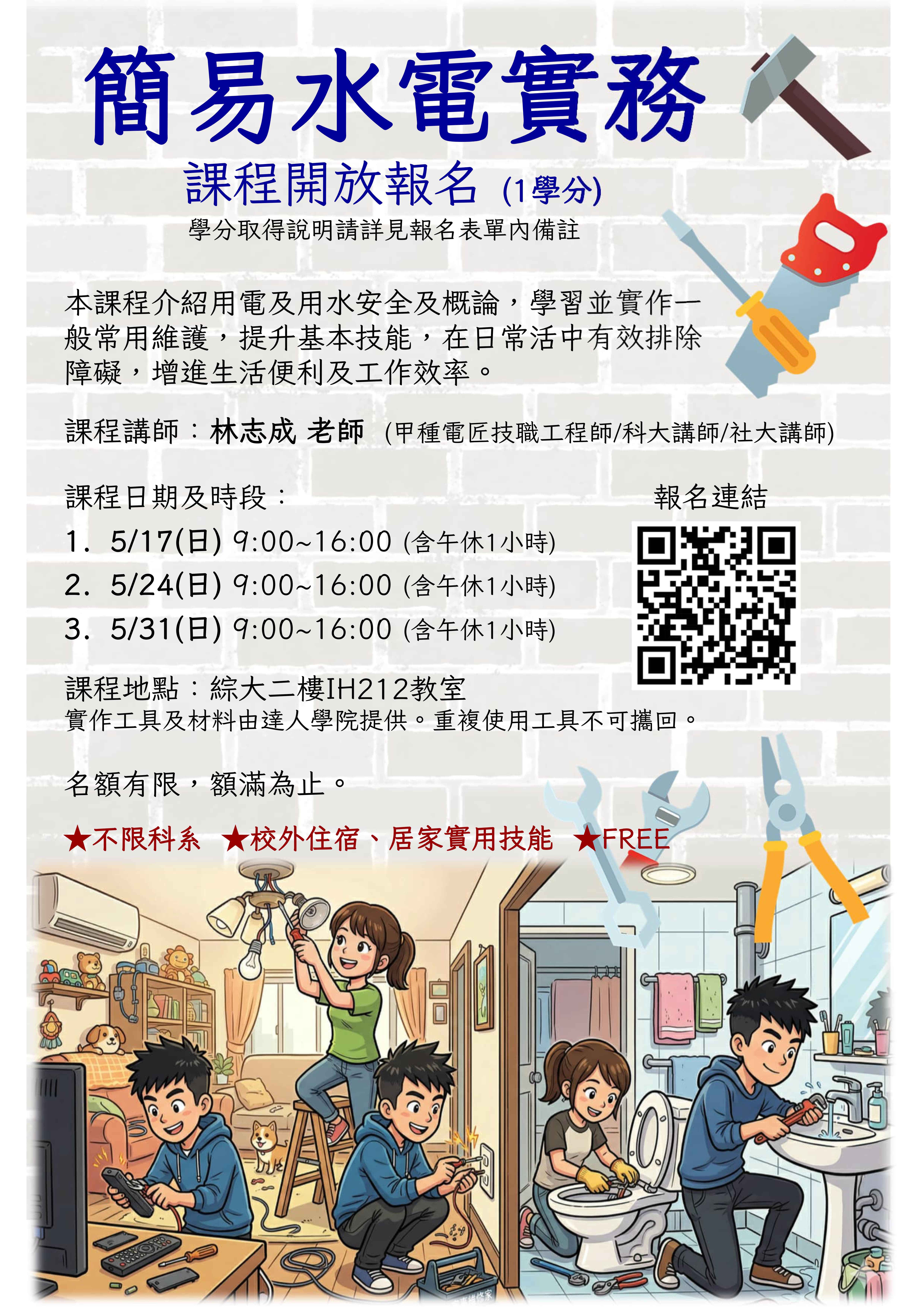 上課講師:林志成 老師 (甲種電匠技職工程師/科大講師/社大講師) 上課地點:本校綜合大樓2樓 IH212 教室 *實作工具及材料由達人學院提供。重複使用工具不可攜回。