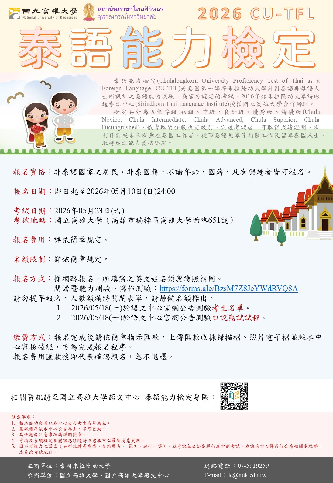 一、旨揭檢定係泰國朱拉隆功大學詩琳通泰語中心授權高雄大學辦理,為官方認定之泰語能力檢定考試。本校語文中心長年辦理成果良好,於114年獲授權為全臺唯一CU-TFL泰語能力檢定認證中心,並於115年與該中心簽署合作備忘錄(MOU),持續深化雙方於語言評量及教育交流之合作。