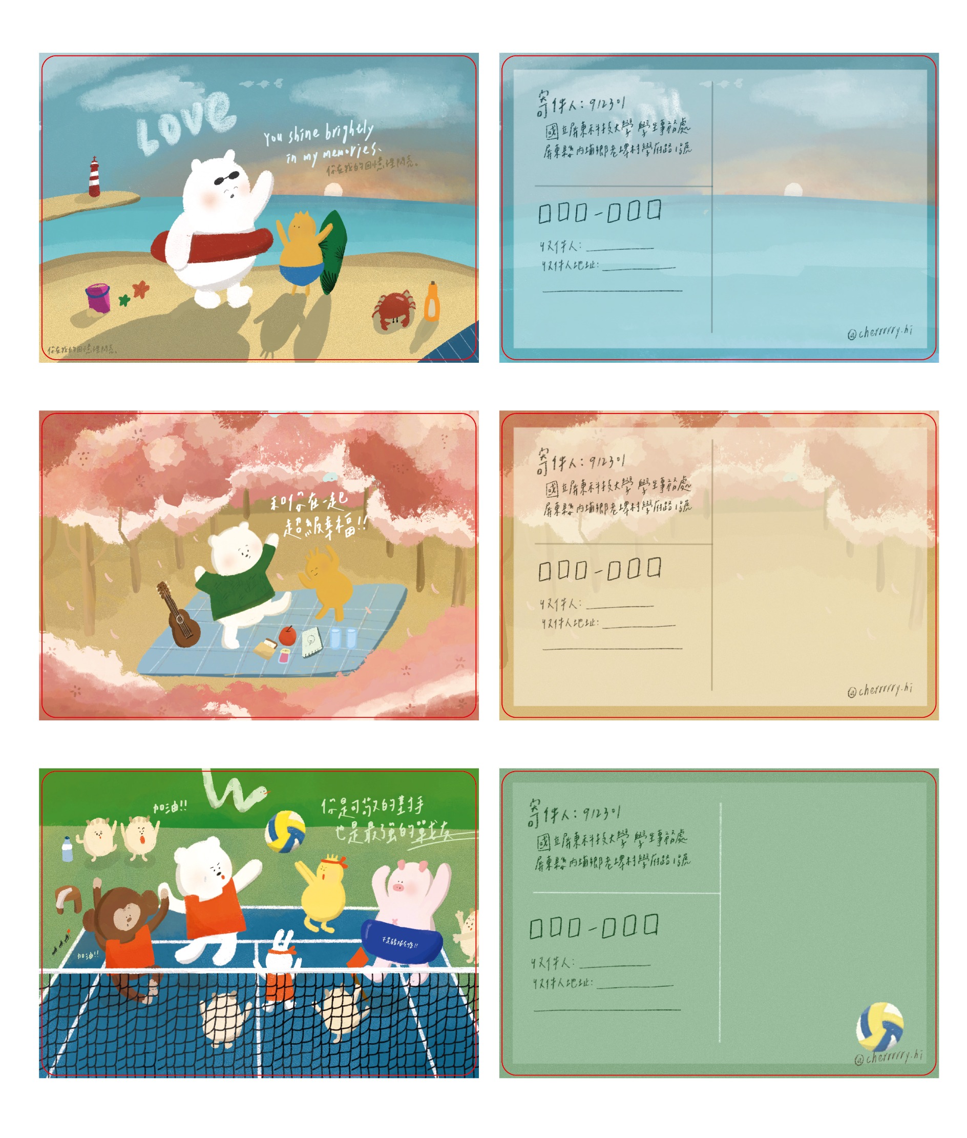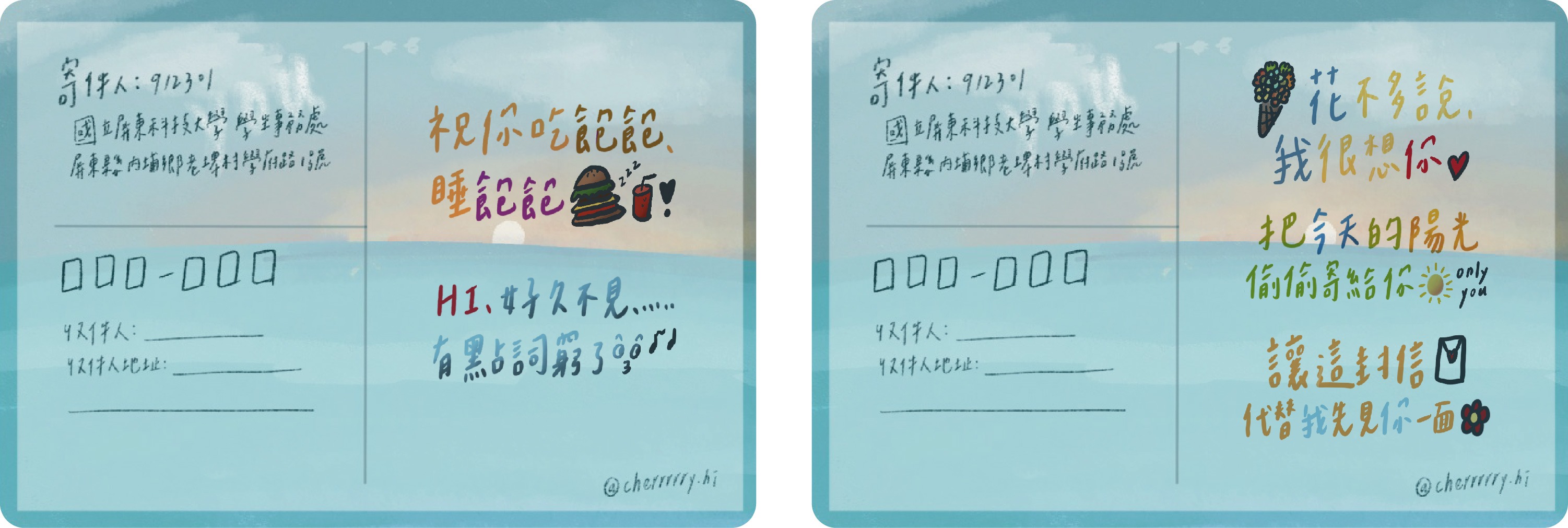 活動一:寄出感恩-全校教職員工生皆可參加~~ 【明信片寄送資格與方式】專屬屏科大教職員工生,想要表達感恩心意,完成以下3步驟 1、選取本活動專屬明信片,並寫下(或畫下)感恩的話語 2、完成背面收件人姓名、地址(請務必填寫『郵遞區號』) 3、投進本活動專屬郵筒(不是郵局哦!) 【明信片與專屬郵筒放置處】 1、農學院-院辦前 2、工學院-4樓電梯口左方休憩桌 3、管理學院-資管系辦 4、人文暨社會科學院-院辦前休憩桌 5、國際學院-1樓中庭 6、獸醫學院-獸醫館1樓玄關 7、達人學院-智慧機電學程辦公室內 8、行政大樓2樓中庭 9、第一餐廳 10、第二餐廳 11、學務處課指導組 (孟祥體育館內) 12、員生社三社門口 (鄰近幼保系系館)--NEW 【明信片寄送時間】:課指組收回已投遞之明信片,於4/21、5/5、5/26,3個時間分批寄出喔~