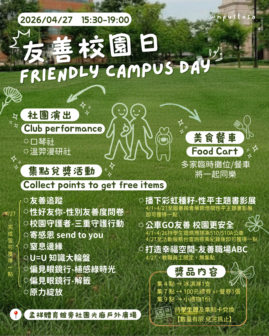4月27日(一)15:30-19:00,地點:體育館旁露天平台【友善校園主題日活動】,無須報名直接前往,本日活動詳如附件海報。