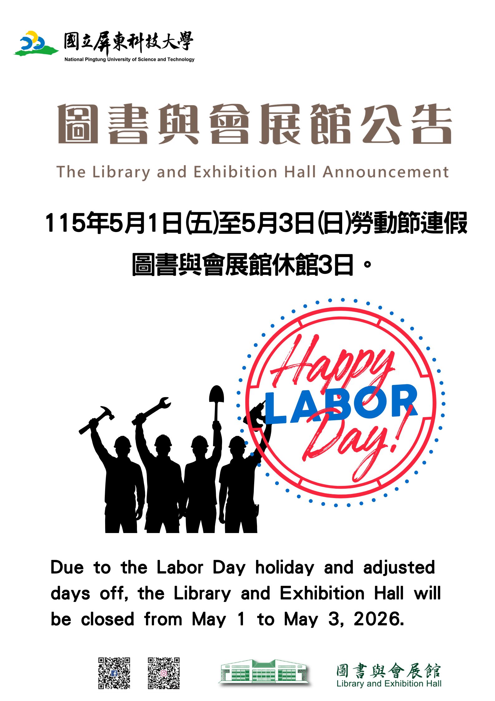 圖書與會展館於115年05月01日(五)至115年05月03日(日),勞動節連假閉館3日。
