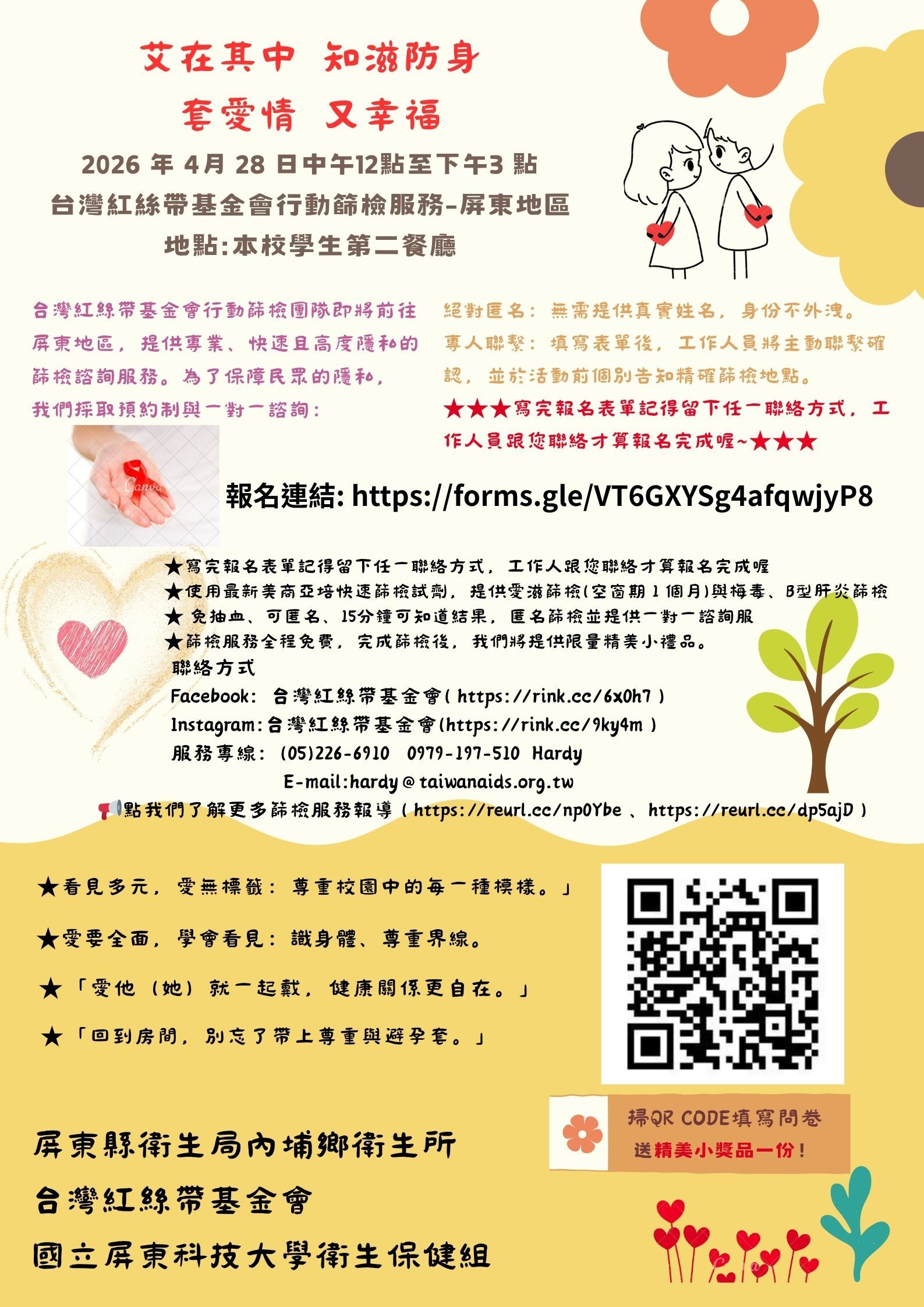 ★看見多元,愛無標籤:尊重校園中的每一種模樣。」 ★愛要全面,學會看見:識身體、尊重界線。 ★「愛他(她)就一起戴,健康關係更自在。」 ★「回到房間,別忘了帶上尊重與避孕套。」 屏東縣衛生局內埔鄉衛生所VS台灣紅絲帶基金會VS國立屏東科技大學衛生保健組