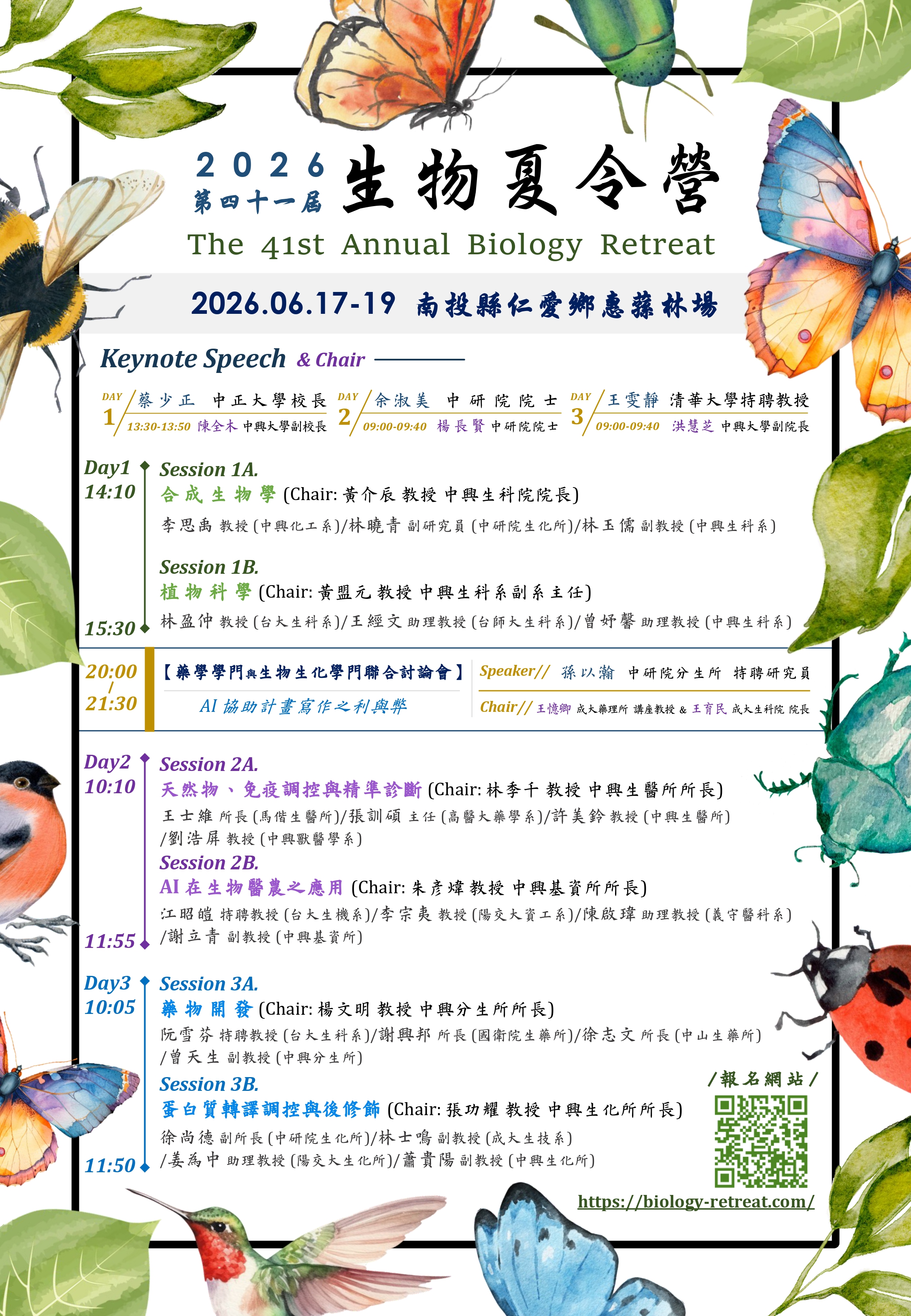 第41屆生物夏令營 41st Biology Retreat 第 41 屆生物夏令營將於 2026 年 6 月 17 日至 6 月 19 日於惠蓀林場舉行,活動以生物相關領域之學術交流為核心,邀集來自大學、研究機構與醫學、生技、農業等跨領域專家學者,共同分享最新研究成果與發展趨勢。會議內容涵蓋合成生物學、植物科學、天然物、免疫調控、精準診斷、AI 在生物醫農之應用、藥物開發,以及蛋白質轉譯調控與後修飾等主題,呈現當代生命科學研究的多元面向。