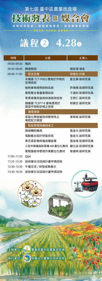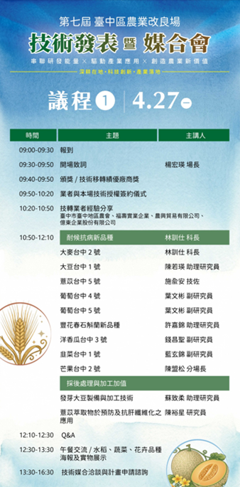 五大技術亮點X鏈結研發X產業應用 1.耐候抗病新品種:大麥、大豆、洋香瓜、韭菜及豐花春石斛蘭新品種。 2.加工加值:發芽大豆製備與加工技術、薏苡萃取物於預防及抗肝纖維化之應用等生產技術。 3.安全生產:葡萄整合害蟲管理技術、青蔥捲葉炭疽病快速檢測技術、鏈黴菌TCSF7-6菌株應用於蔬菜作物耐逆境之技術。 4.循環減碳:客製化開發緩效供肥特性之堆肥配方開發。 5.智能管理與機械省工:嫁接輔助機具、青花菜影像辨識收穫裝置、電動載台設計研製技術。 現場加碼!超實用互動內容 1.技轉業者經驗分享|了解技術商品化的成功關鍵與實務經驗。 2.政府計畫諮詢服務|補助怎麼申請?現場直接問 3.1對1媒合洽談|與研發團隊面對面交流,促進合作媒合與技術落地。 活動資訊: 活動時間:115年4月27日(一)至4月28日(二)09:30-15:30(09:00開放報到) 活動地點:臺中區農業改良場 綜合大樓2樓(彰化縣大村鄉松槐路370號) 參加對象:企業、公協會、法人機構、學研單位、農民團體等有意瞭解或導入農業技術者 報名連結:https://forms.gle/3JTdTLPzXEaqrSx17 聯絡人:財團法人農業科技研究院 蔡瓊慧 專案經理 電話:03-5185179 / E-mail:11522020@mail.atri.org.tw