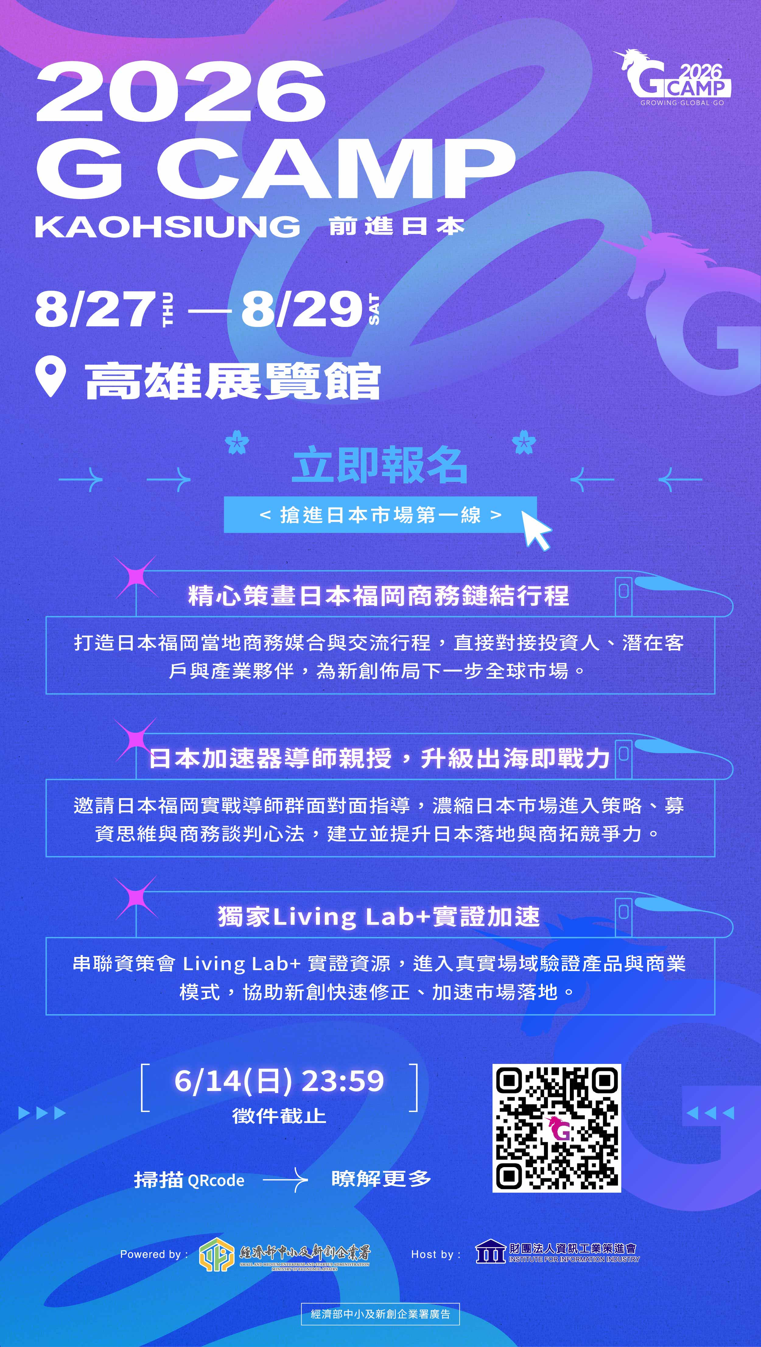 直通日本市場的機會來了! 2026 G Camp聚焦日本福岡,結合在地資源與國際業師,協助新創團隊加速拓展海外市場,此次邀請日本國際級業師來台親授市場實戰解析與深度諮詢商業法規一次掌握,全面強化進軍日本的關鍵能力,打造可落地的市場拓展策略。 一、活動資訊: ・Boot Camp|8/27(四)– 8/28(五) ・Final Pitch|8/29(六) ・地點|高雄展覽館 ・報名截止|6/14(日)23:59 ・徵件申請:https://reurl.cc/X2RbxE 二、活動說明會 《Go Japan! 分享暨徵件說明會》 ・日期:5/6(三) ・時間:14:00–16:00(13:30開放報到) ・地點:資策會民生科服中心808會議室(台北市松山區民生東路四段133號8樓) 說明會報名:https://reurl.cc/np04mv 三、Final Pitch|簡報決賽亮點 獲選團隊將有機會贏得: ・臺灣-福岡來回機票 ・國際展會曝光與行銷資源加持 四、聯繫窗口 Walis:02-6607-2188 Archey(阿奇):02-6607-2281