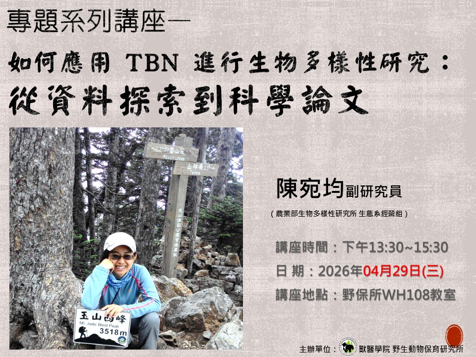 本演講將介紹如何應用台灣生物多樣性網絡 (Taiwan Biodiversity Network,TBN)匯集之生態調查開放資料進行生物多樣性研究,將從資料探索、開放資料結構與特性、資料處理 (data mining)到生態分析與論文產出的完整流程,並進一步說明常見分析方法(如物種分布與熱點分析)之適用情境與限制,以建立正確的研究思維與資料使用能力。 ------------------------------ 主講人:陳宛均副研究員(農業部生物多樣性研究所 生態系經營組) 講座主題:如何應用 TBN 進行生物多樣性研究:從資料探索到科學論文 講座時間:115年04月29日(三)13:30-15:30 講座地點:野保所108教室 ★敬請踴躍到場聆聽☆