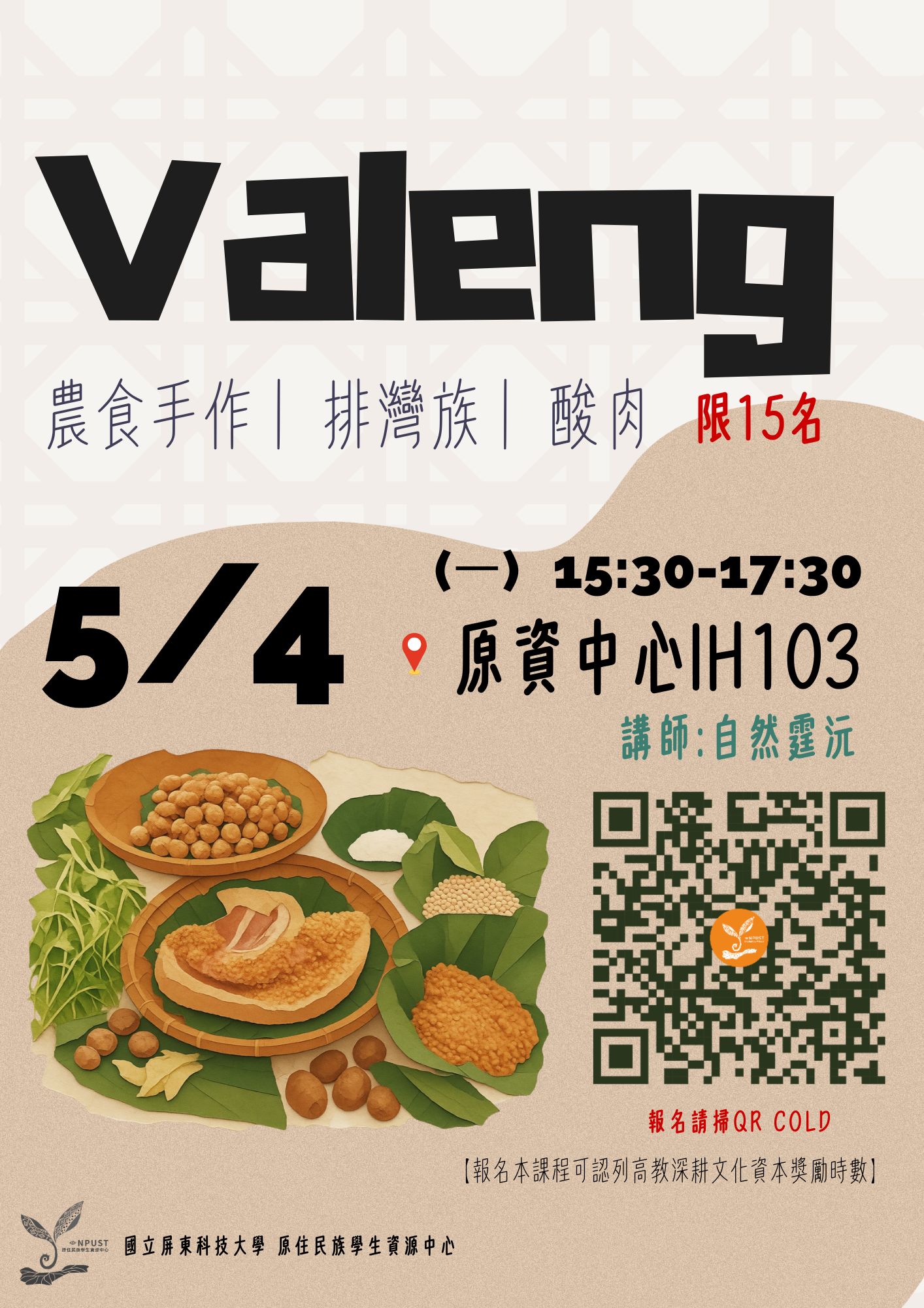 一、 活動目的 為增進學生對原住民族飲食智慧之了解,本中心特別舉辦排灣族傳統保存食「Valeng(酸肉)」體驗課程。透過文化脈絡介紹與實作示範,帶領同學從食物出發,深入認識排灣族與土地的連結,實踐跨文化學習。