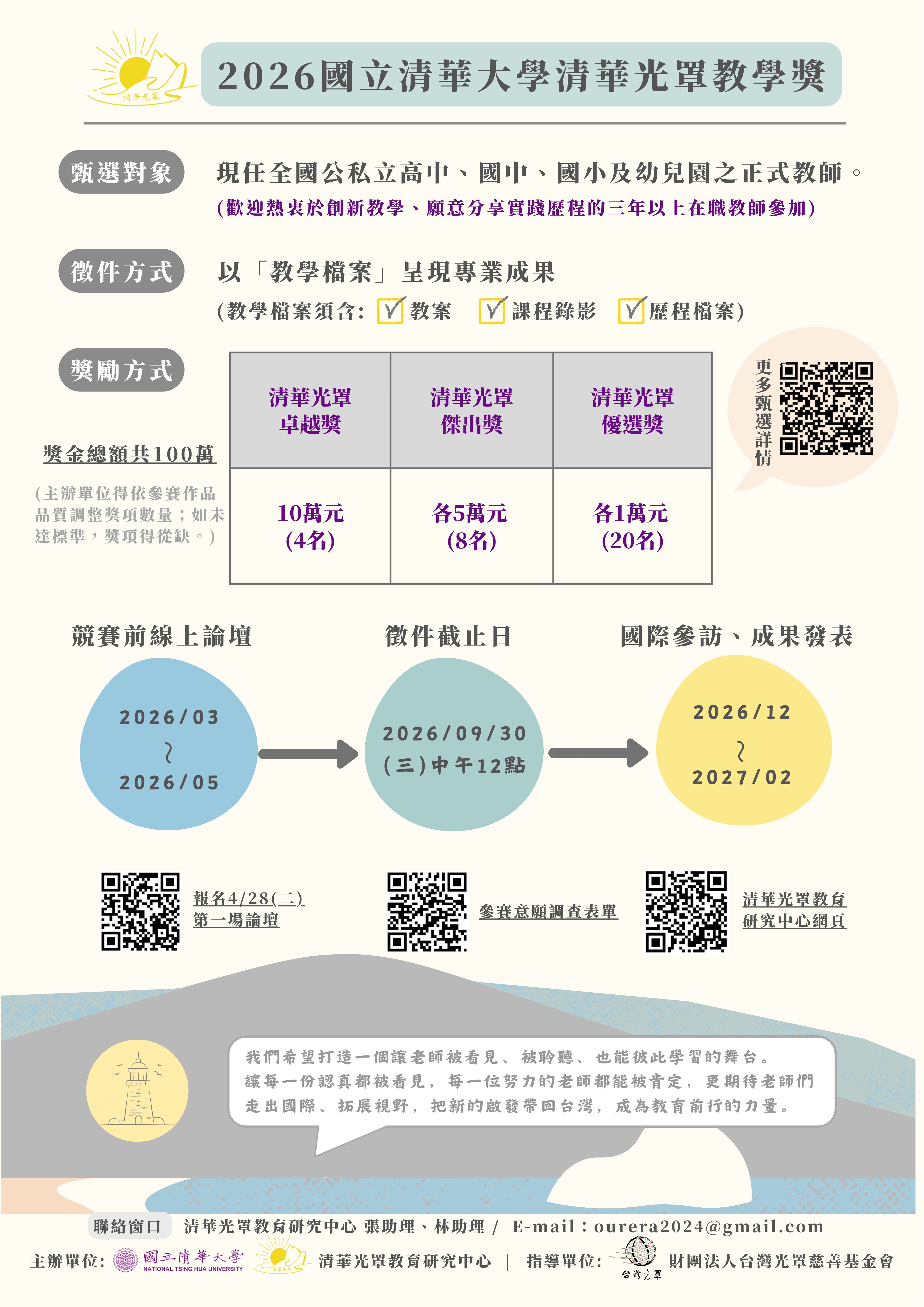 《教學獎》國立清華大學光罩教育研究中心辦理「2026國立清華大學清華光罩教學獎」,敬邀本校教師踴躍報名參加