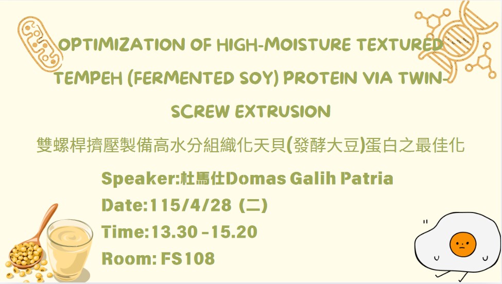 【食品系公開演講】雙螺桿擠壓製備高水分組織化天貝(發酵大豆)蛋白之最佳化/杜馬仕博士候選人
