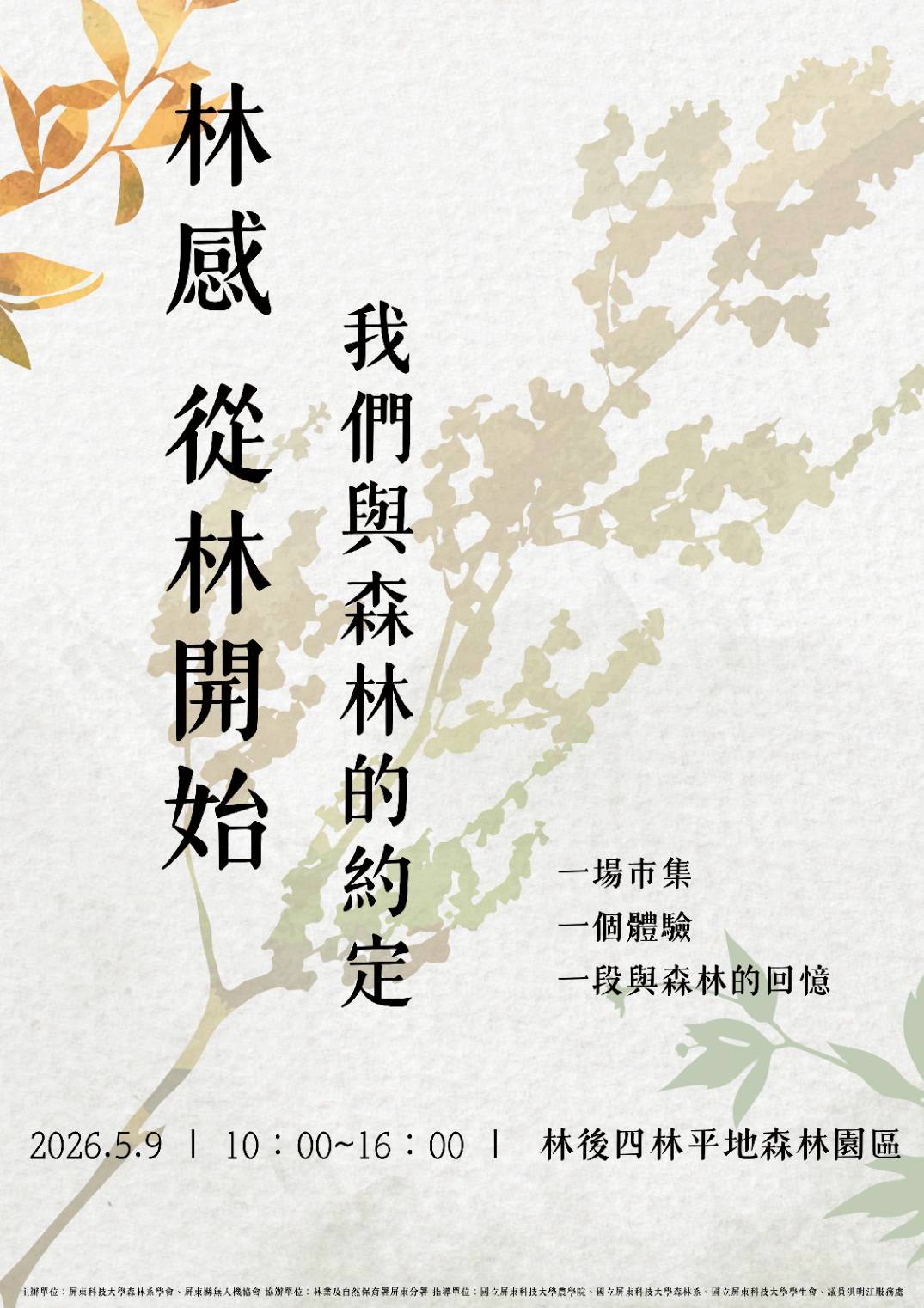 一、「林感.從林開始——我們與森林的約定」,是一場關於相遇的邀請。把森林帶進日常,將山林的氣息化為一座可以走入的市集。從手中的一件林產小物,到一段來自山林的故事,從觸摸、品味到傾聽,每一刻,都是與森林重新連結的開始。 透過攀樹體驗、葉拓體驗與無人機足球,我們不只是走進森林,更是在不同方式中,重新認識它、感受它。 誠摯邀請你走進這片由森林延伸出的日常風景,放慢腳步,感受木質的溫度、葉影的呢喃,與我們一起在市集中相遇。無論是想找一份屬於自己的森林記憶,或只是單純來走走看看,都歡迎你加入這場溫柔的聚會。