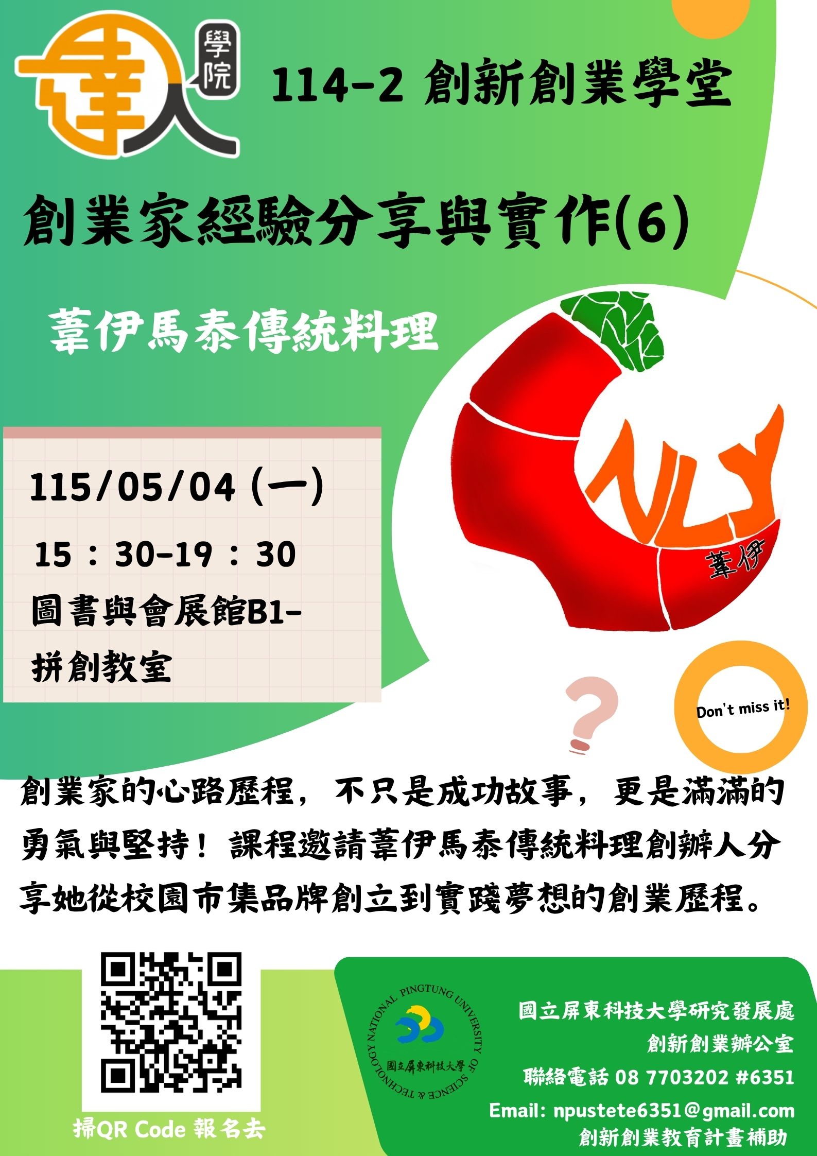 四、聯繫窗口 (一)聯絡人:創新創業辦公室 王專員 (二)聯絡電話:08-7703202轉6351 (三)電子信箱:npustete@gmail.com
