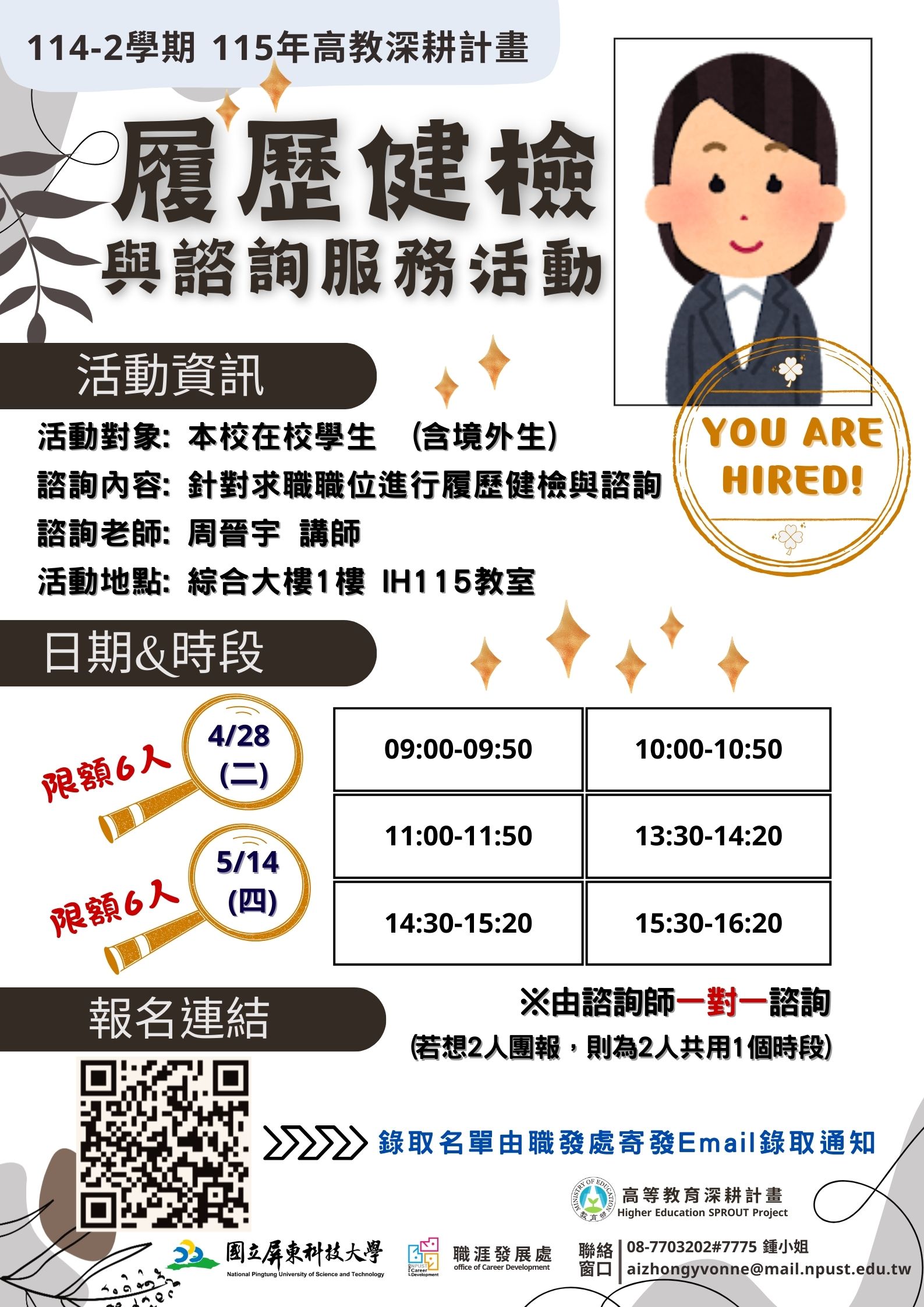 【履歷健檢與諮詢服務】(4/28(二)場次) 僅1名額,錯過不再><把握良機!!!: