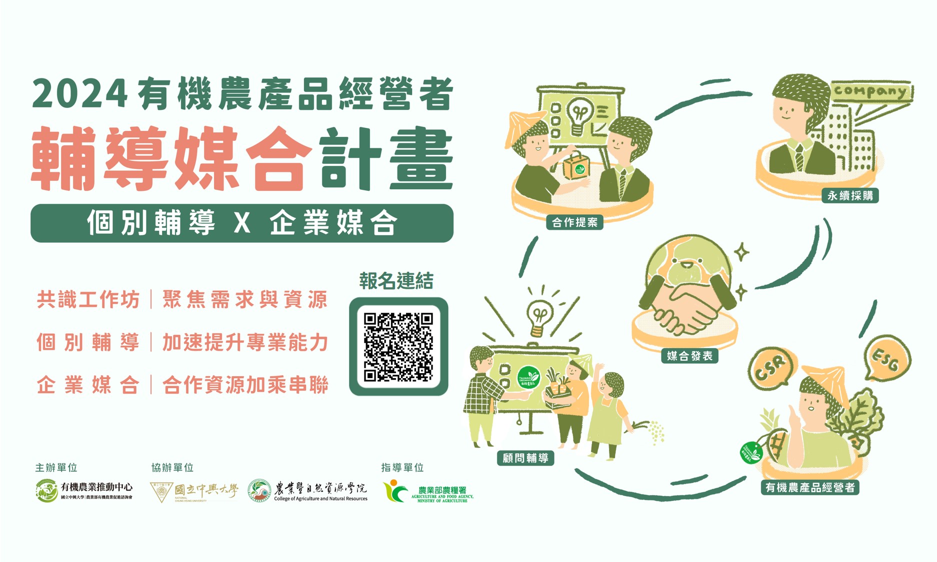 說明: 一、為促進有機農產品經營者與企業、通路或其他跨域單位合作,國立中興大學有機農業推動中心辦理「有機農產品經營者輔導媒合計畫」,包含共識工作坊、顧問個別輔導及媒合相關活動,敬邀有意與企業或通路合作之有機農產品經營者(通過臺灣有機農產品驗證之經營者)報名徵選。