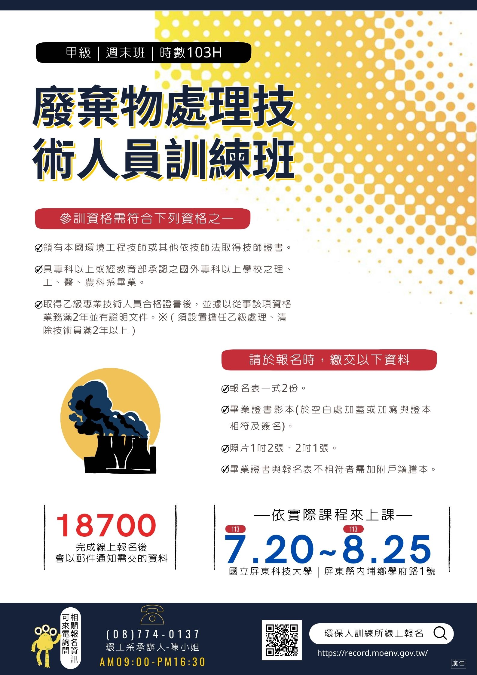 ◇◇「甲級廢棄物處理專業技術人員訓練」熱烈招生中◇◇ 「甲級廢棄物處理技術人員」 ◎上課日期:113年7月20日~113年8月25日 ,總時數103小時 ◎上課時間:8:00 ~ 18:00 每週六、週日(詳細時間依照課表) ◎學 費:18,700元 ◎受訓資格:詳細請參閱海報 ◎報名方式: ◎線上報名:https://record.moenv.gov.tw/NERAWEB/Voucher/wFrmRecent.aspx 【進入網站-開班訊息-點選廢棄物處理專業技術人員訓練-選擇期別-報名】 ◎洽詢電話:(08)774-0137環工系EP210實驗室 陳小姐