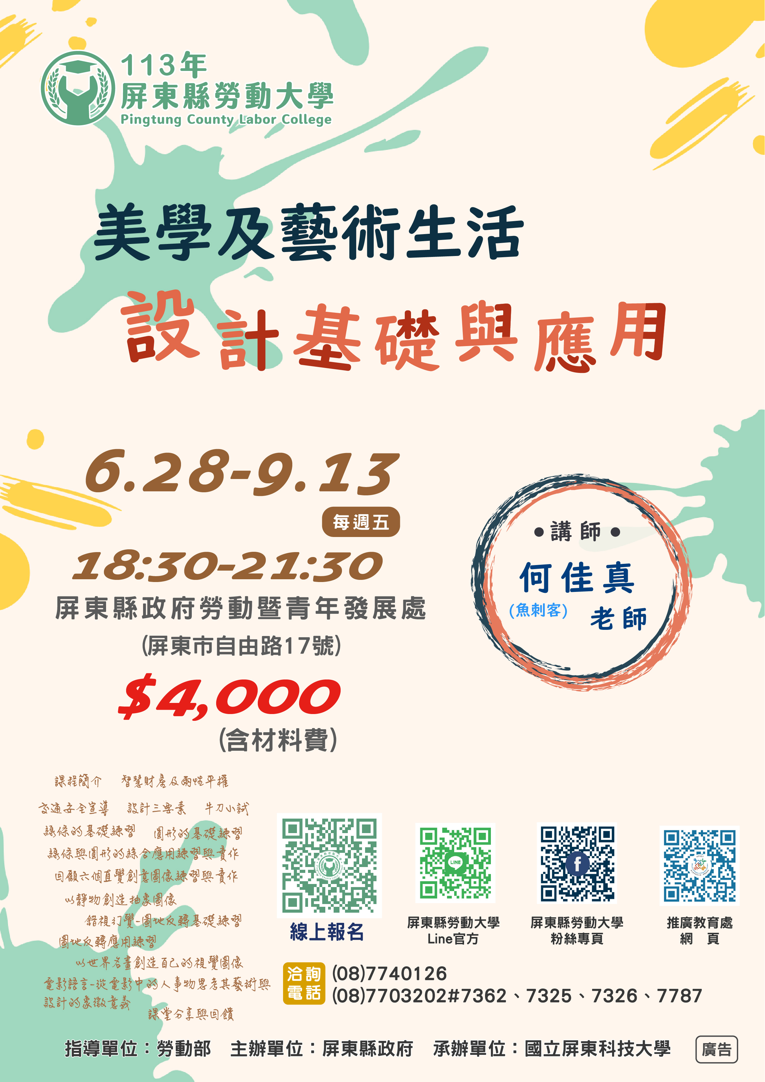 【課程招生 | 美學及藝術生活系列課程】 #生活創意素描 #設計基礎與應用 #藝術生活 本次邀請到魚刺客藝術團體的何佳真老師及周耀東老師 引領大家進入美學及藝術生活🌟 👉報名網址:https://reurl.cc/NQGVxk -------------------------------------- ✨美學及藝術生活-設計基礎與應用 以基礎設計為入門,引導學員應用兩隻筆,從點線面構成體的概念,認識線條名稱到圓形的基礎練習、綜合應用練習到實作,進而創造屬於自己獨一無二的視覺圖像,以提升民眾對美感事物的欣賞、想像與鑑賞力。 🗓時間:6/28-9/13每星期五18:30-21:30 💰學費:4,000元(含材料費)