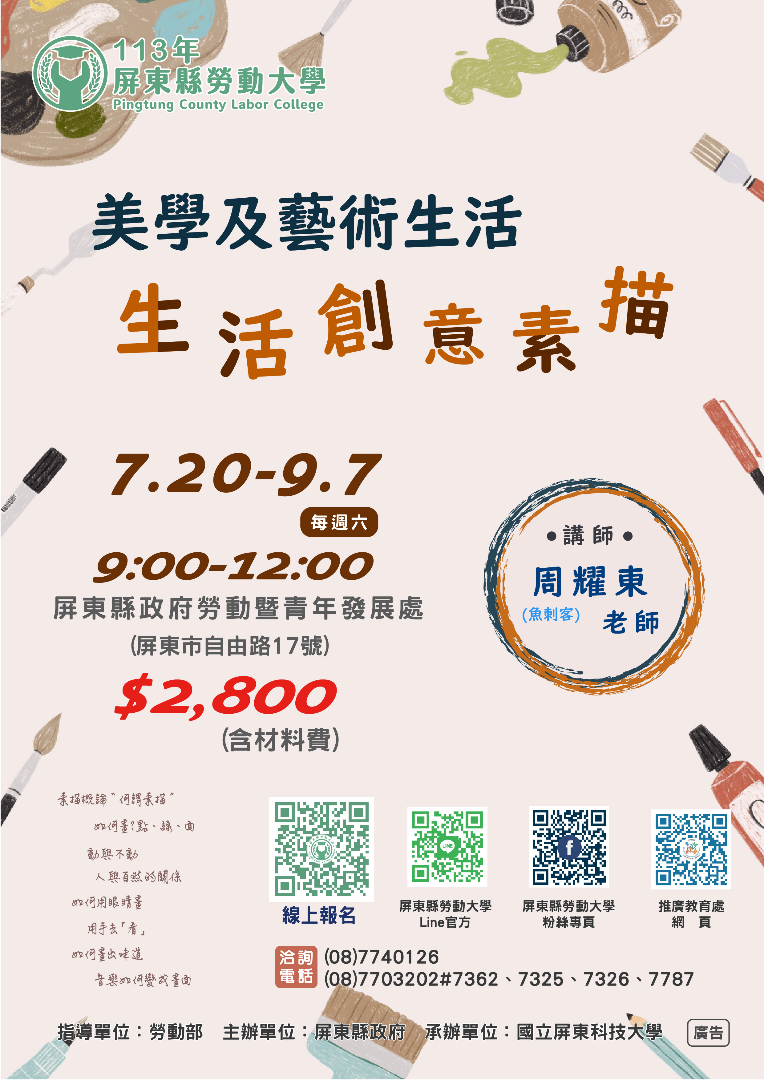 ✨美學及藝術生活-生活創意素描 素描是生活情感體驗的表達方式,以素描基礎概念培養學員創造性思維及表達能力,透過藝術詮釋生活美學。 🗓時間:7/20-9/7每星期六9:00-12:00 💰學費:2,800元(含材料費) -------------------------------------------- ※其他課程資訊※ 📍地點:屏東縣政府勞動暨青年發展處(屏東市自由路17號) 👤授課對象:年滿15歲,設籍、工作或就學於屏東縣一般民眾 ☎️洽詢電話:(08)7740126、(08)7703202#7362 🔗報名網址:https://reurl.cc/NQGVxk