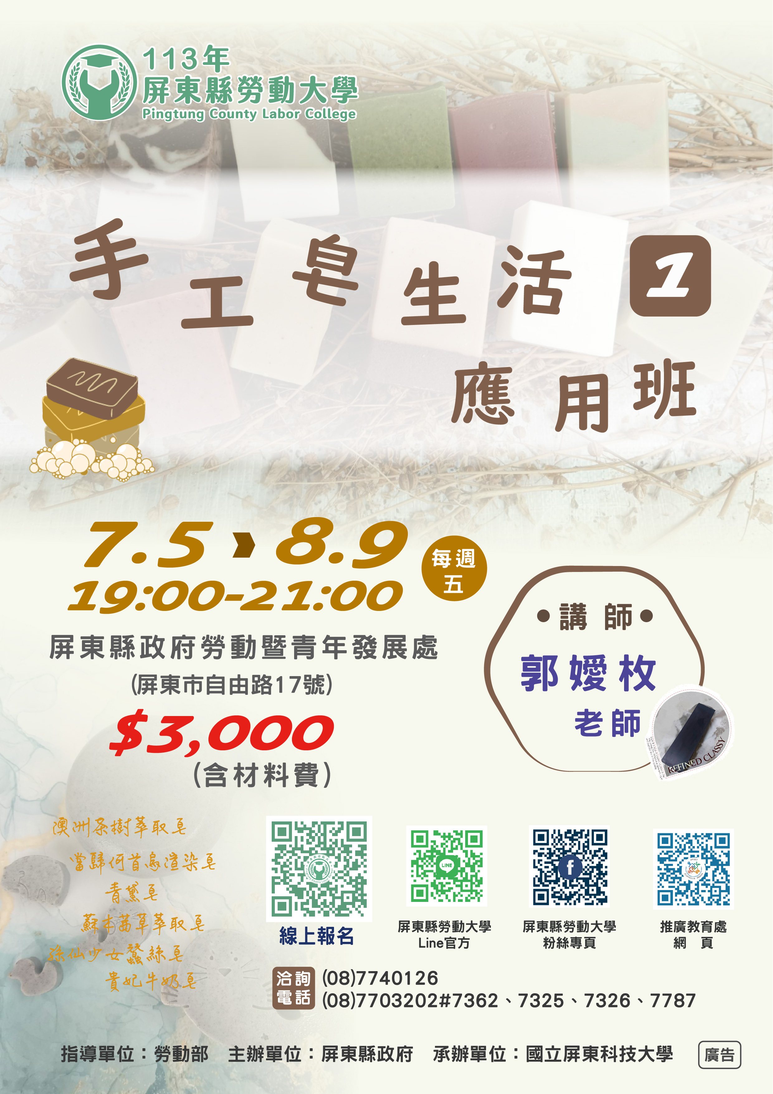 【📢課程招生 | 手工皂生活應用班(1)】 #手工皂 #綠色環保 #生活手作 -------------------------------------------- 綠色環保時代 手工皂的單純、無害大為流行 課程教導手工皂的製作方法及流程 製作專屬自己的手工皂🫶🫶 💧澳洲茶樹萃取皂 💧當歸何首烏渲染皂 💧青黛皂 💧蘇木茜草萃取皂 💧孫仙少女蠶絲皂 💧貴妃牛奶皂 一同來感受手作的獨特魅力❣️ -------------------------------------------- ※報名資訊※ 🗓時間:7/5-8/9每星期五晚上19:00-21:00 📍地點:屏東縣政府勞動暨青年發展處(屏東市自由路17號) 💰學費:3,000元(含材料費) 👤授課對象:年滿15歲,設籍、工作或就學於屏東縣一般民眾 ☎️洽詢電話:(08)7740126、(08)7703202#7326 🔗報名網址:https://reurl.cc/NQGVxk