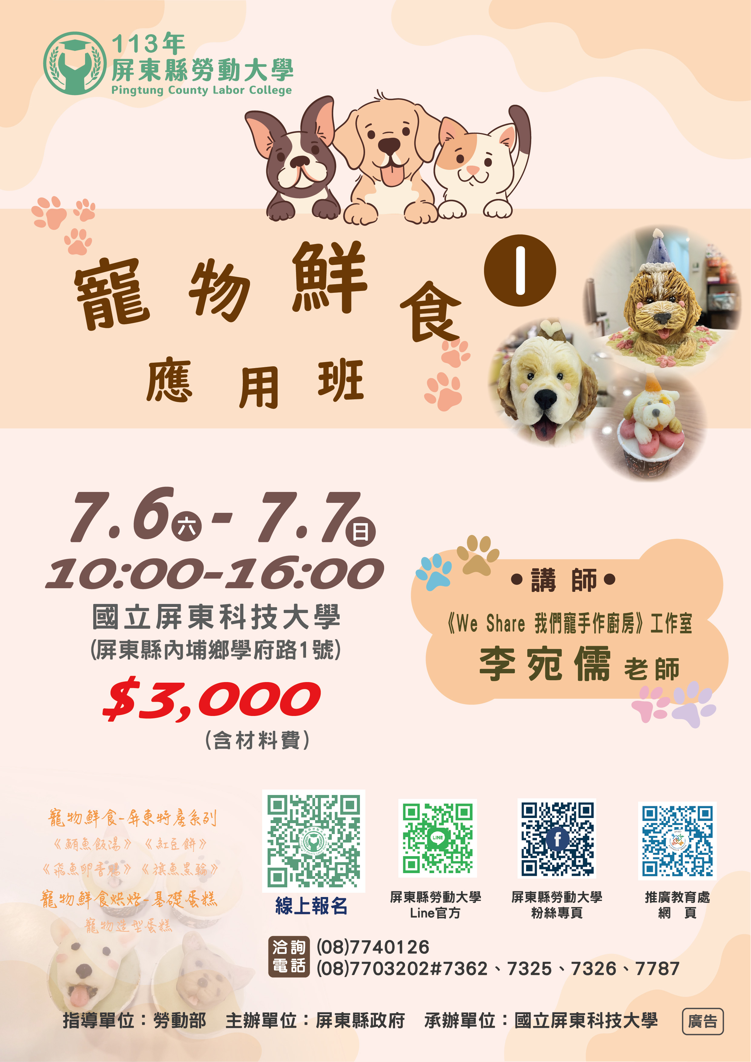 【📢課程招生 | 寵物鮮食應用班(1)🐶🐱】 #寵物友善 #寵物食品 #手作料理 -------------------------------------------- 利用多種當季盛產的蔬菜水果搭配 用不同的烹飪方式製作鮮食料理 課程中從零開始製作💪 可學習到👇 🌟肉品處理方式 🌟澱粉的選擇與比例 🌟不同的烹飪手法 🌟油脂的攝取 🌟食材屬性的季節搭配 每期課程的手做品項不同喔🤩 本次課程主題為屏東特產系列+寵物造型蛋糕🧁 把握難得機會🙌🙌🙌 -------------------------------------------- ※報名資訊※ 🗓時間:7/6-7/7,10:00-16:00 📍地點:屏科大(屏東縣內埔鄉學府路1號) 💰學費:3,000元(含材料費) 👤授課對象:年滿15歲,設籍、工作或就學於屏東縣一般民眾 ☎️洽詢電話:(08)7740126、(08)7703202#7362 🔗報名網址:https://reurl.cc/NQGVxk