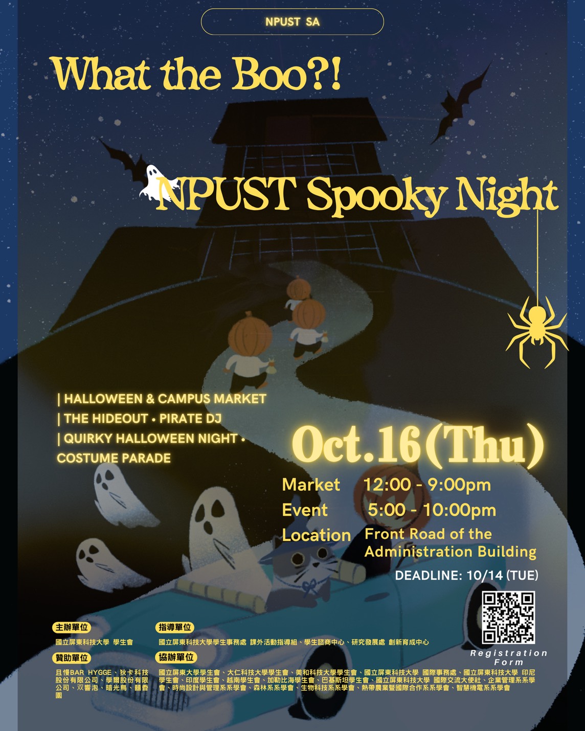 ▪️ Costume Competition Registration: Register online before October 14 to enter the costume contest. For more details, please check NPUST Student Association Instagram https://reurl.cc/Y3g4yx or the registration form https://reurl.cc/axOerG
