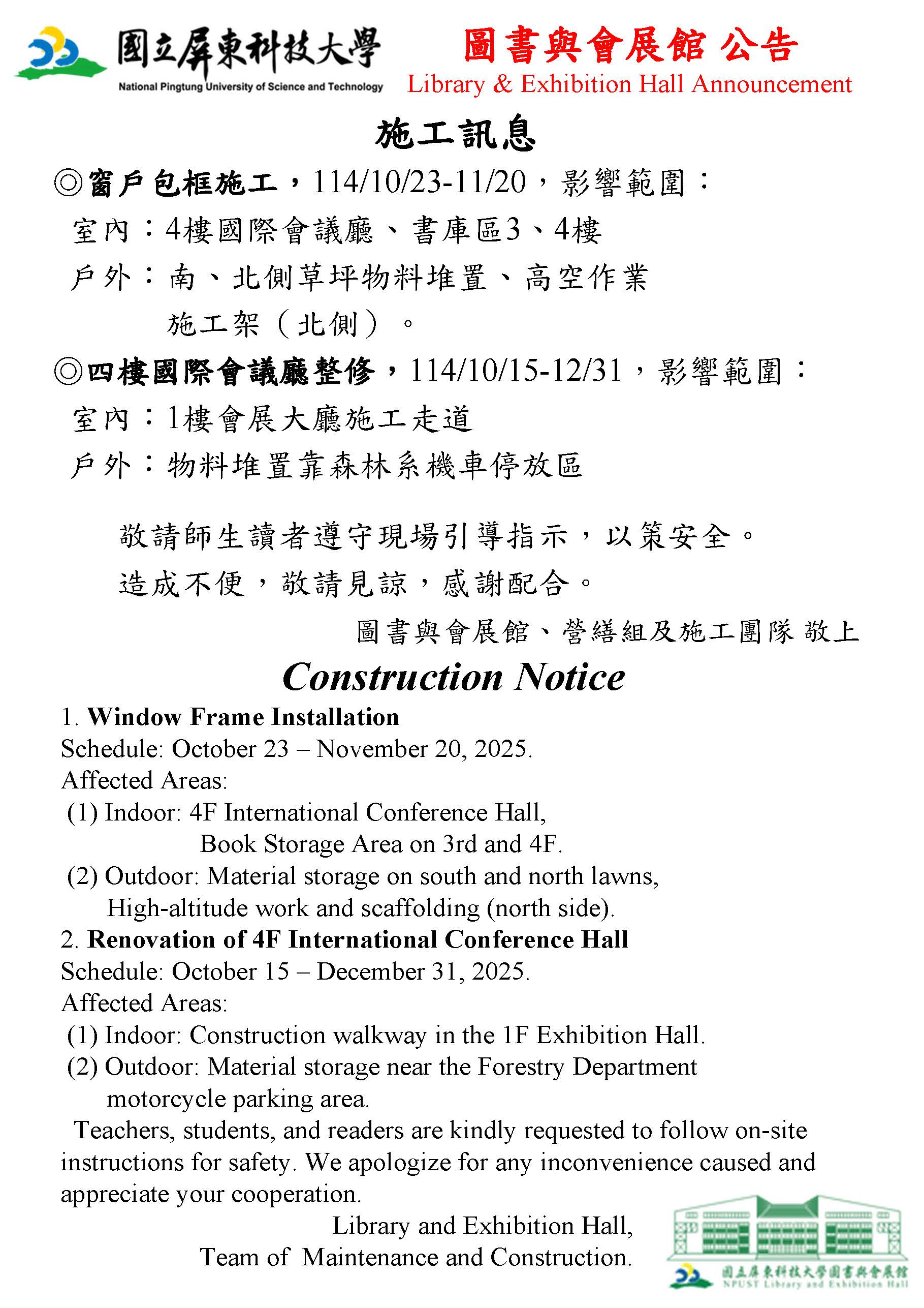 1. Window Frame Installation Schedule: October 23 – November 20, 2025. Affected Areas: (1) Indoor: 4F International Conference Hall, Book Storage Area on 3rd and 4F. (2) Outdoor: Material storage on south and north lawns, High-altitude work and scaffolding (north side).